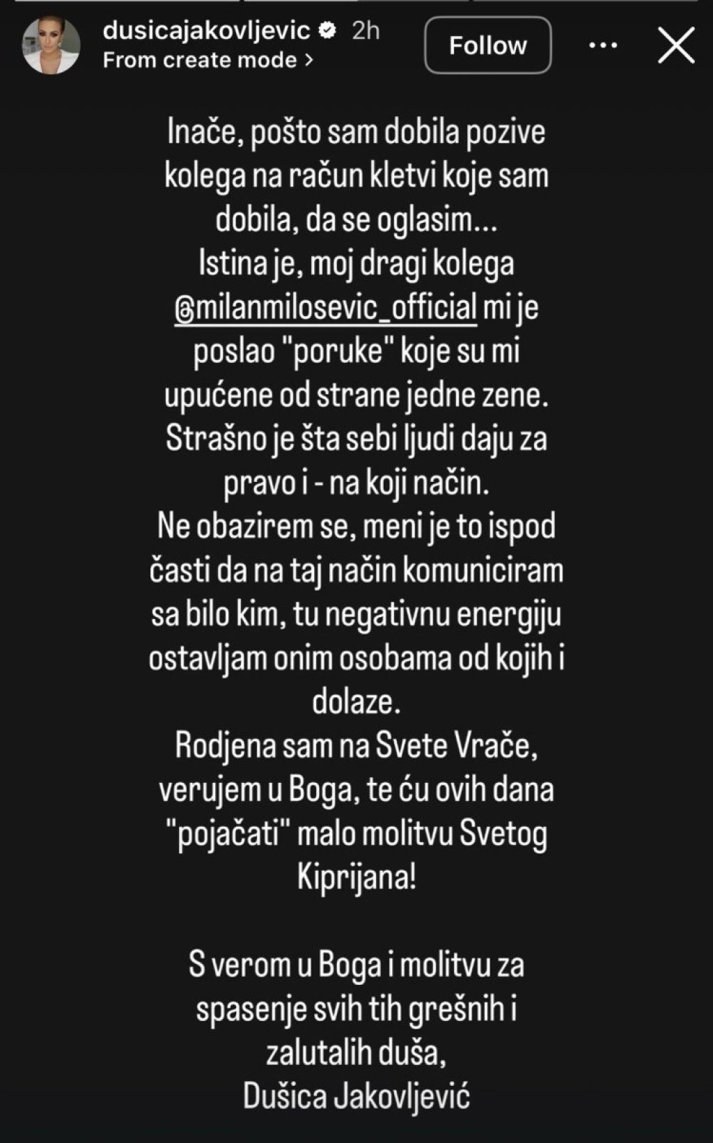 "Rođena sam na Svete Vrače, verujem u Boga, te ću ovih dana "pojačati" malo molitvu Svetog Kiprijana! S verom u Boga i molitvu za spasenje svih tih grešnih i zalutalih duša, Dušica Jakovljević", napisala je voditeljka.