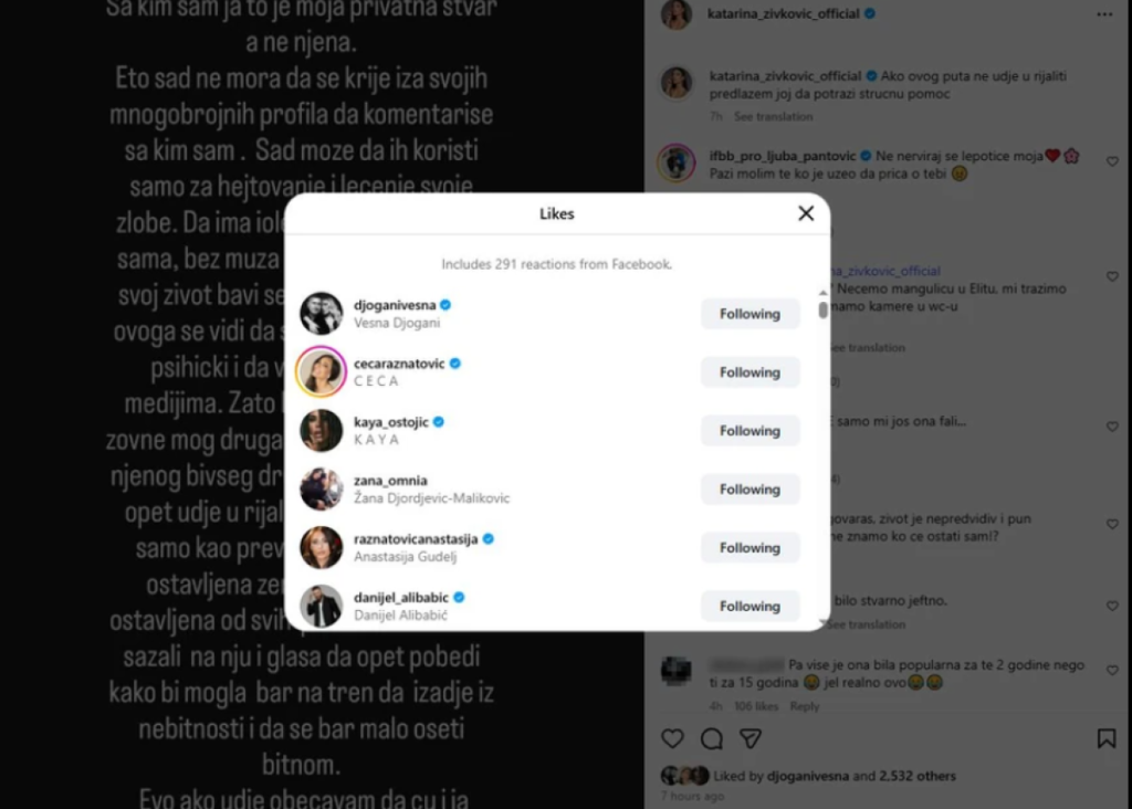 "Sa kim sam ja to je moja privatna stvar a ne njena. Eto sad ne mora da se krije iza svojih mnogobrojnih profila da komentariše sa kim sam. Sad može da ih koristi samo za hejtovanje i lečenje svoje zlobe. Da ima iole mozga ne bi ostala sama, bez muža i prijatelja. Ko nema svoj zivot bavi se tuđim životima a iz ovoga se vidi da se oseća veoma loše psihički i da vapi za pažnjom u medijima", poručila je Katarina nekadašnjoj prijateljici na Instagramu, pa dodala: