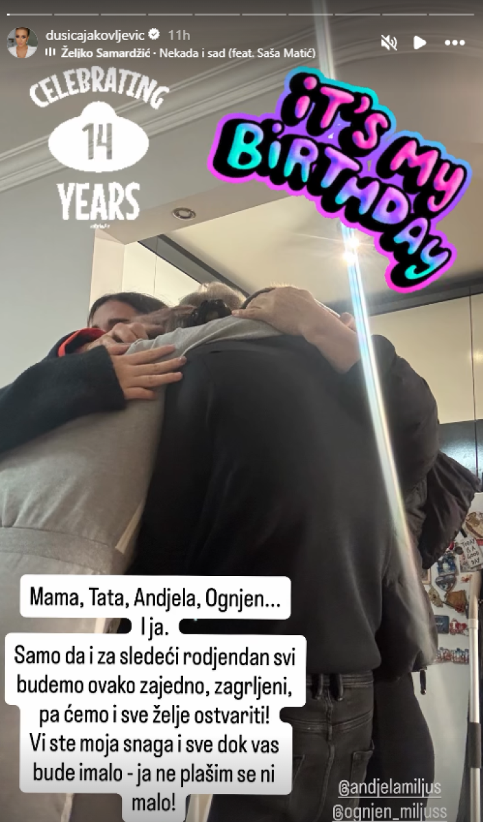 "Mama, tata, Anđela, Ognjen i ja. Samo da i za sledeći rođendan svi budemo ovako zajedno, zagrljeni, pa ćemo i sve želje ostvariti. Vi ste moja snaga i sve dok vas bude imalo, ja ne plašim se nimalo", napisala je voditeljka uz fotografiju.