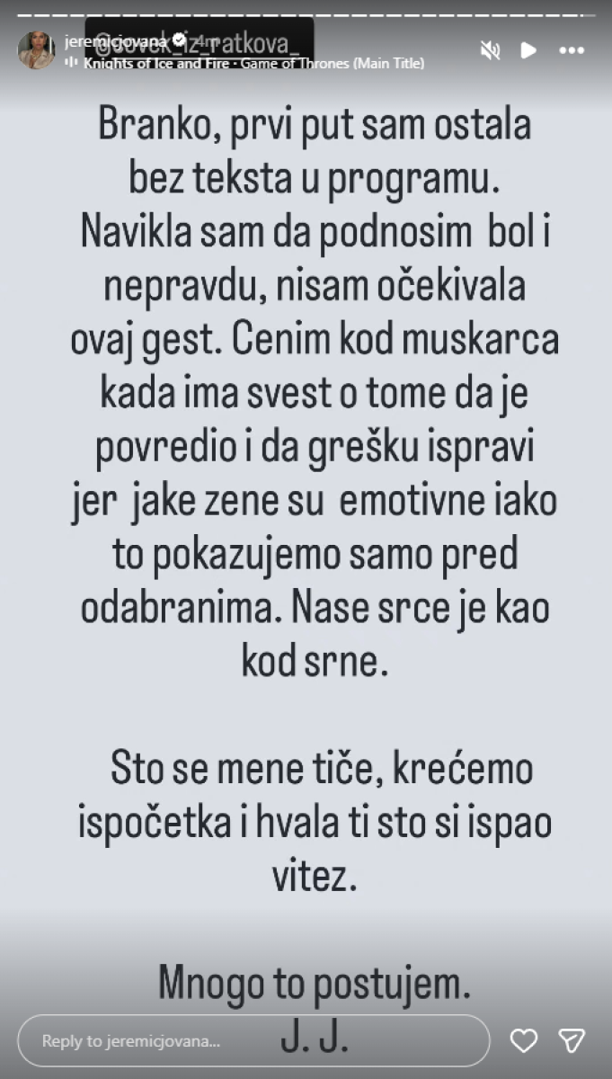 "Branko, prvi put sam ostala bez teksta u programu. Navikla sam da podnosim bol i nepravdu, nisam očekivala ovaj gest. Cenim kod muškarca kada ima svest o tome da je povredio i da grešku ispravi jer jake žene su emotivne iako to pokazujemo samo pred odabranima. Naše srce je kao kod srne. Što se mene tiče, krećemo ispočetka i hvala ti što si ispao vitez. Mnogo te poštujem", napisala je Jeremićeva putem svog Instagram profila.