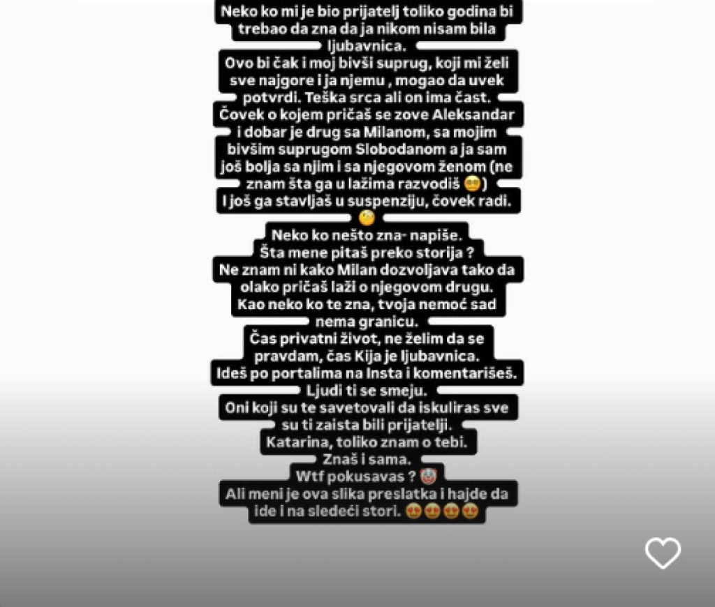 "Neko ko mi je bio prijatelj toliko godina bi trebalo da zna da ja nikom nisam bila ljubavnica. Ovo bi čak i moj bivši suprug, koji mi želi sve najgore i ja njemu, mogao da potvrdi. Teška srca, ali on ima čast. Čovek o kojem pričaš se zove Aleksandar i dobar je drug sa Milanom, sa mojim bivšim suprugom Slobodanom, a ja sam još bolja sa njim i sa njegovom ženom (ne znam zašto ga lažima razvodiš i još stavljaš u suspenziju, čovek radi) Neko ko nešto zna - napiše. Šta mene pitaš preko storija? Ne znam ni kako Milan dozvoljava da tako olako pričaš laži o njegovom drugu. Kao neko ko te zna, tvoja nemoć sada nema granicu. Čas privatni život - ne želim da se pravdam, čas Kija je ljubavnica. Ideš po portalima na Instagramu i komentarišeš. Ljudi ti se smeju! Oni koji su te savetovali da iskuliraš sve su ti zaista bili prijatelji. Katarina, toliko znam o tebi. Znaš i sama. Šta pokusavas?"
