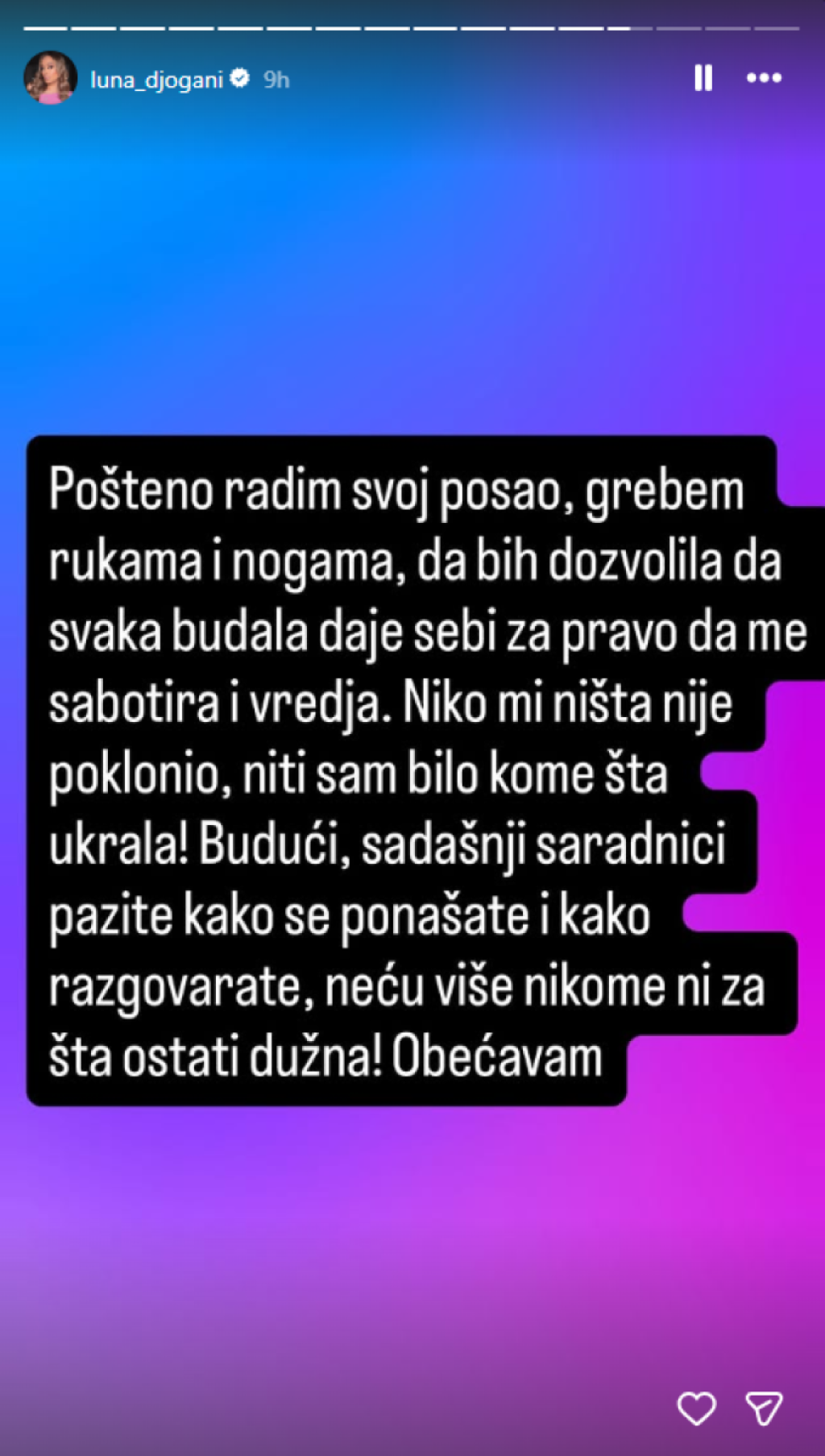 - Gospođa je poslala moju poruku ćerki i ćerka njena, neka kriminalac okačila je mene na stori sa celom mojom novčanom ponudom, koju ja svakome šaljem. Njena ćerka je to okačila i isprozivala me na storiju - otkrila je vidno besna Luna.