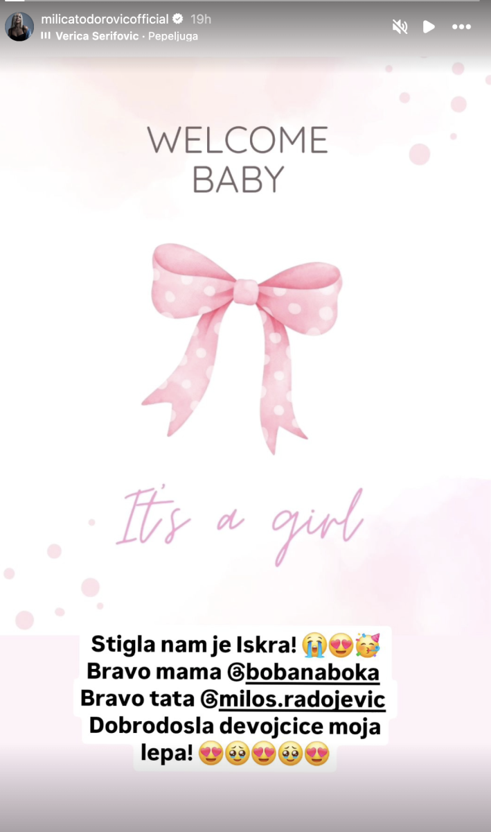 "Stigla nam je Iskra, bravo mama Bobana, bravo tata. Dobrodošla, devojčice moja lepa", napisala je Milica, ne krijući oduševljenje zbog dolaska devojčice.