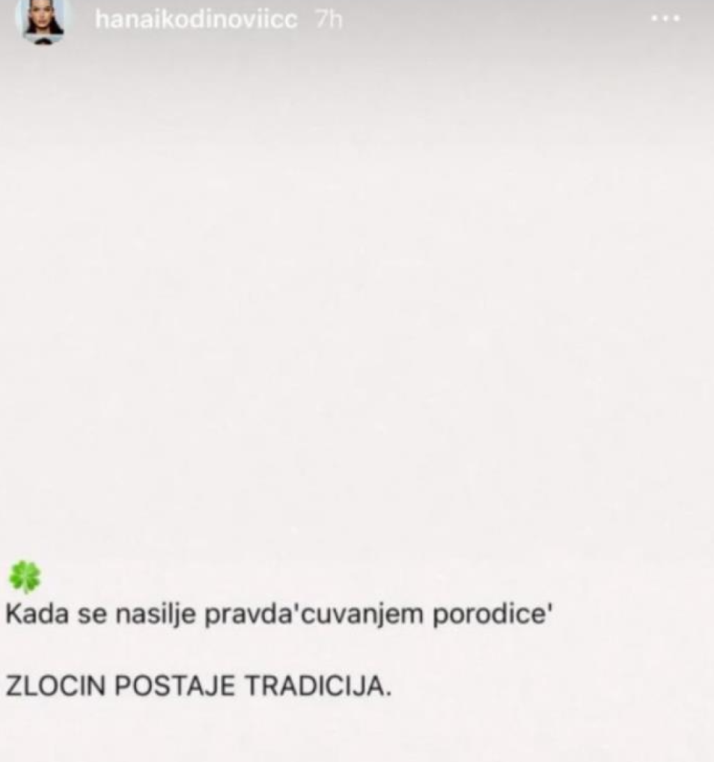 "Kada se nasilje pravda 'čuvanjem porodice' zločin postaje tradicija", piše u objavi koju je podelila Hana Ikodinović.