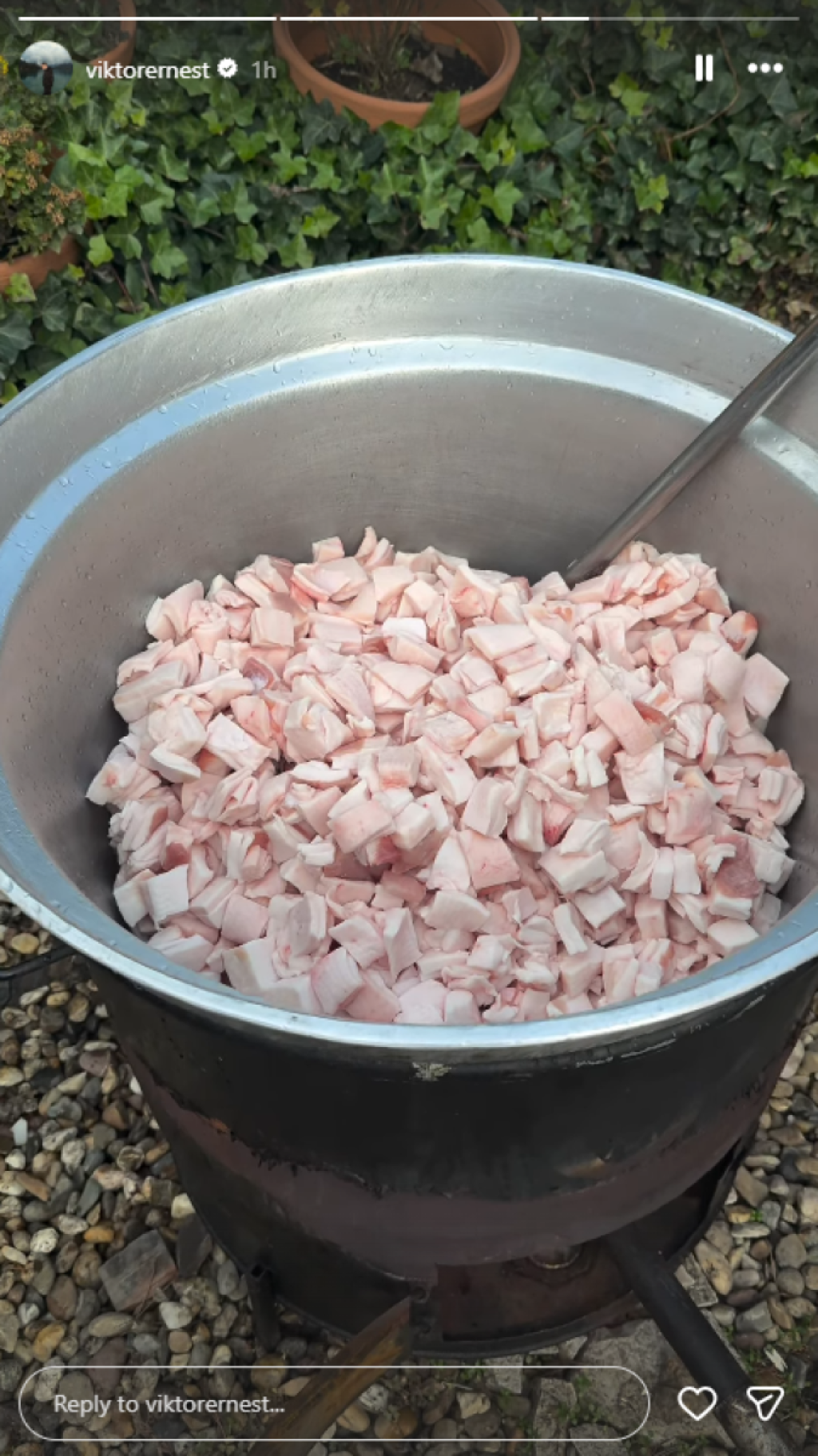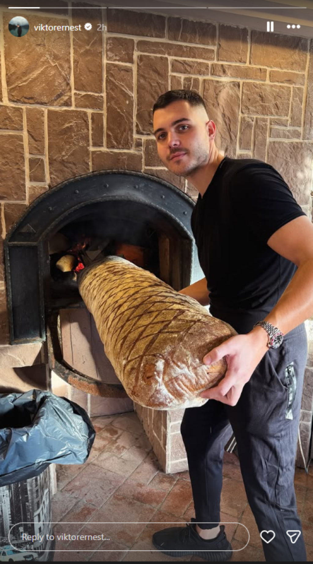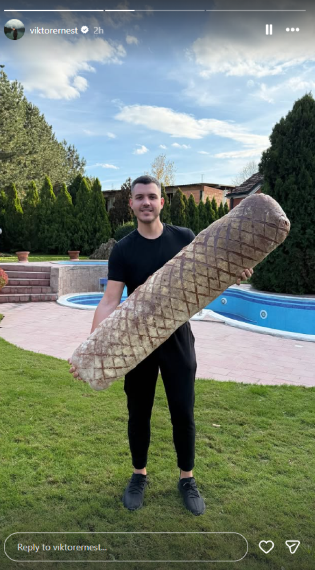 Viktor se fotografisao dok je prenosio ogroman hleb, a uslikao je i slaninu u kotliću montiranom u dvoripštu.