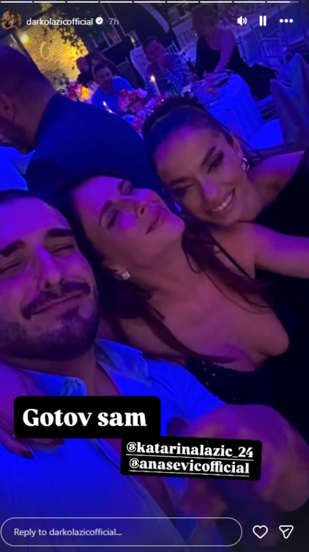 U jednom momentu Ana i Darko su zapevali zagrljeni, a nešto kasnije im se pridružila i Katarine. Darko je fotografiju sa bivšom i sadašnjom suprugom prokomentarisao rečima: "Gotov sam".
