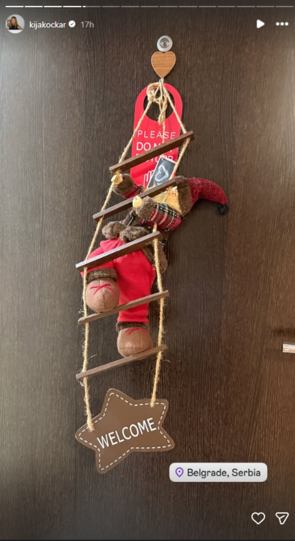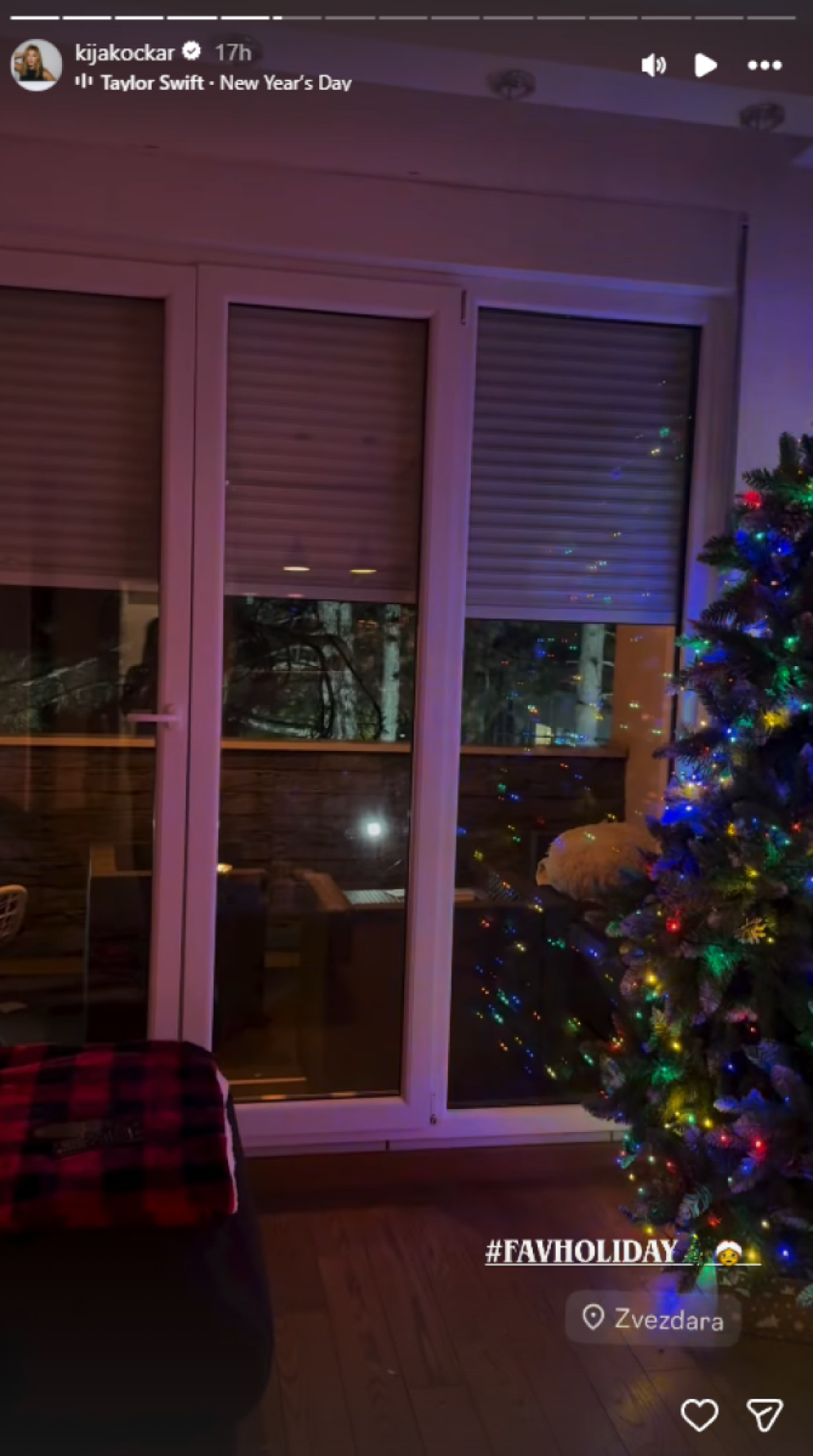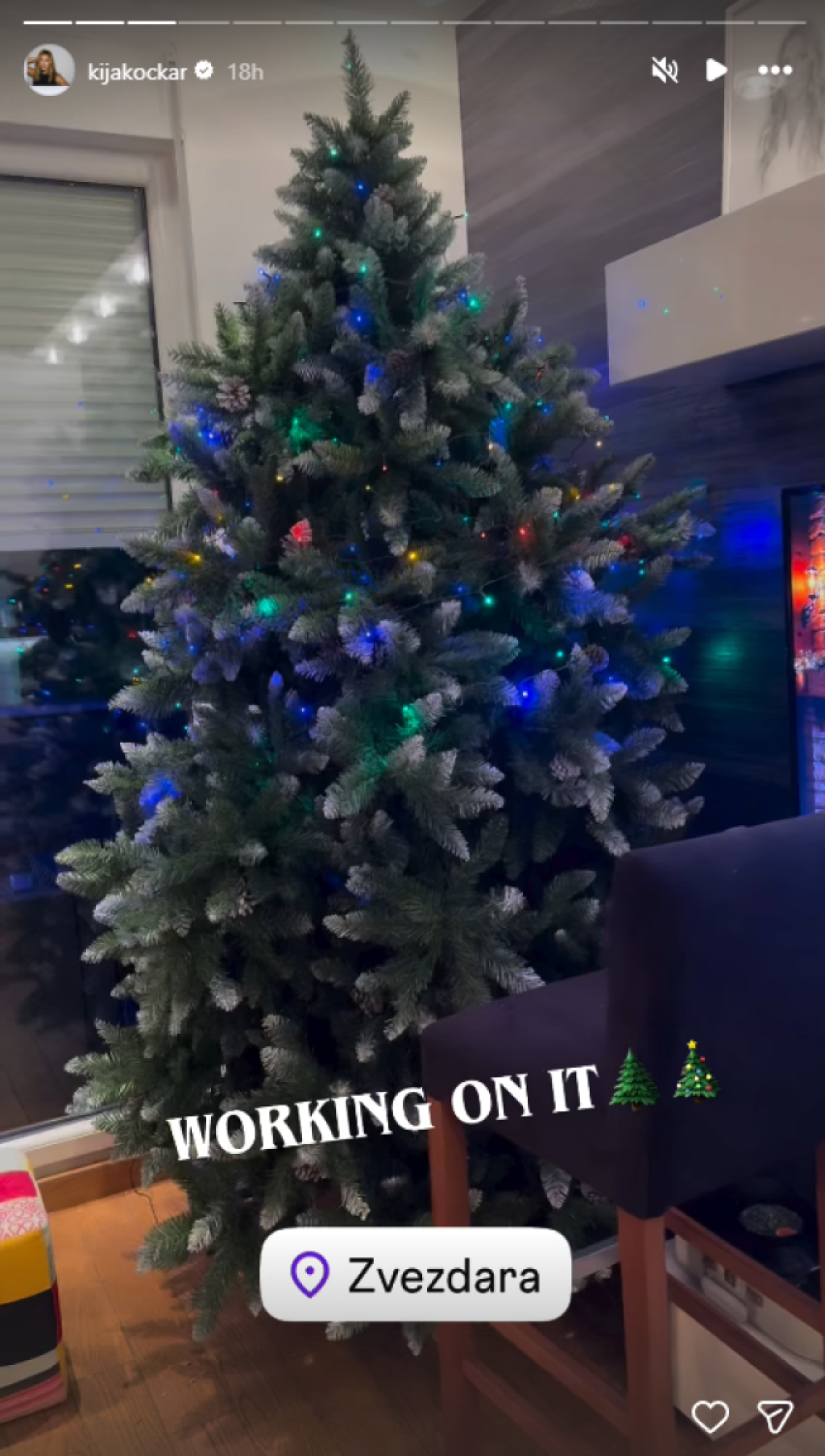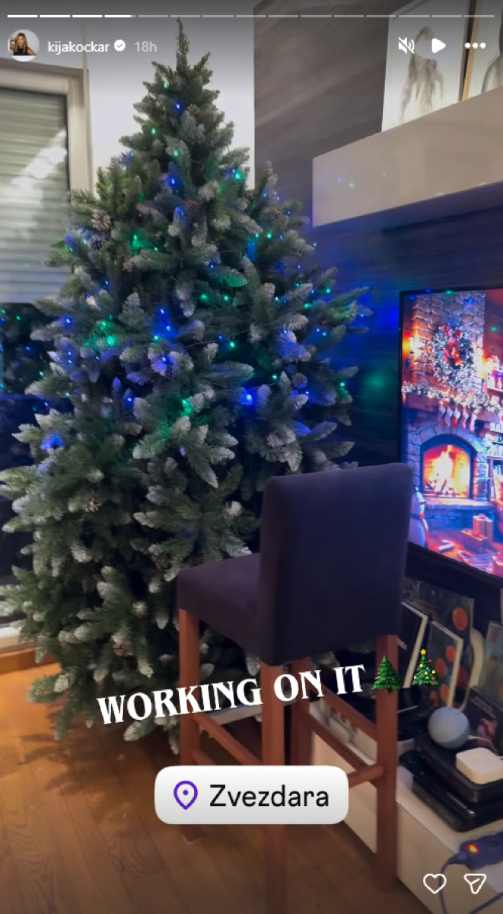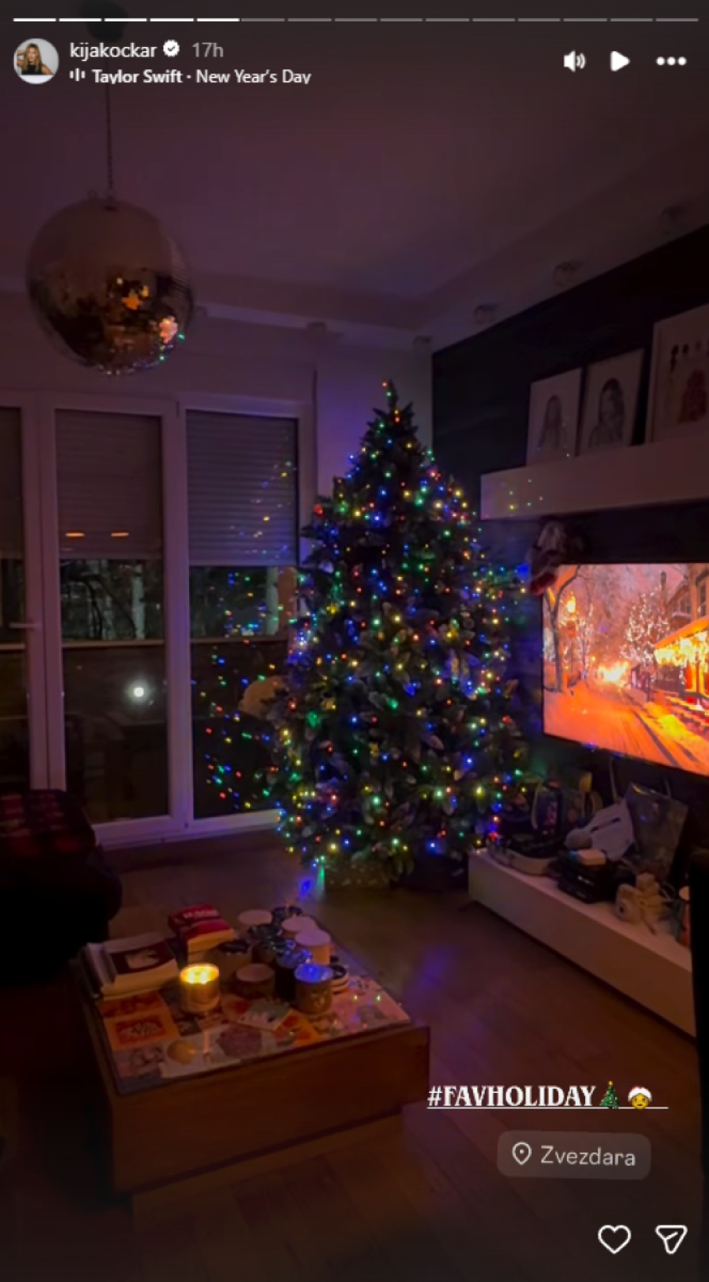 Pored jelke, ceo stan je u prazničnim notama, pa je tako na televizoru snimak novogodišnje idile, na stolu mirišljave sveće i praznične šolje. Trenutak koji je Kiju najviše iznenadio je sneg koji je u tom trenutku pao, pa je pokazala i pogled sa svoje terase.