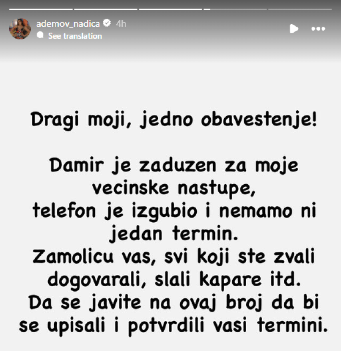"Dragi moji, jedno obaveštenje! Damir je većinski zadužen za moje nastupe, telefon je izgubio i nemamo nijedan termin. Zamoliću vas, svi koji ste zvali i zakazivali, slali kapare itd. da se javite na na ovaj broj da bi se potvrdili i upisali vaši termini", napisala je Nadica koja je otkrila kako bi volela da uradi silikone.