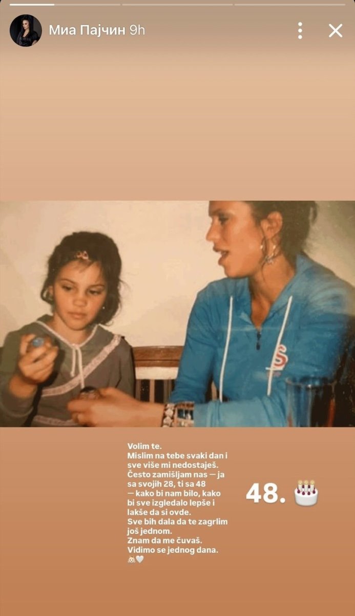 "Volim te. Mislim na tebe svaki dan i sve više mi nedostaješ. Često zamišljam nas - ja sa svojih 28, ti sa 48, kako bi nam bilo, kako bi sve izgledalo lepše i lakše da si ovde. Sve bih dala da te zagrlim još jednom. Znam da me čuvaš. Vidimo se jednog dana", napisala je Mia uz njihovu zajedničku fotografiju.