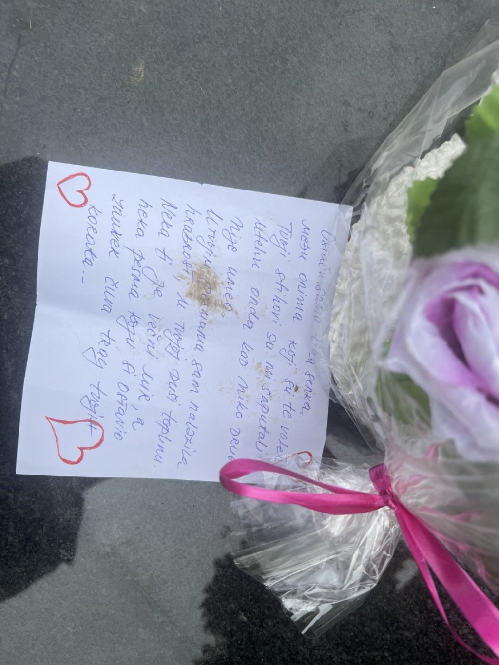 "Ostaću samo tvoja tiha senka među onima koji su te voleli. Tvoji stihovi su mi šaputali utehu onda kada niko drugi nije umeo. U tvojim pesmama sam nalazila hrabrost, u tvojoj duši toplinu. Neka ti je večni mir, a neka pesma koju si ostavio zauvek čuva trag tvojih koraka", piše na papiru, na kom su nacrtana i tri crvena srca.