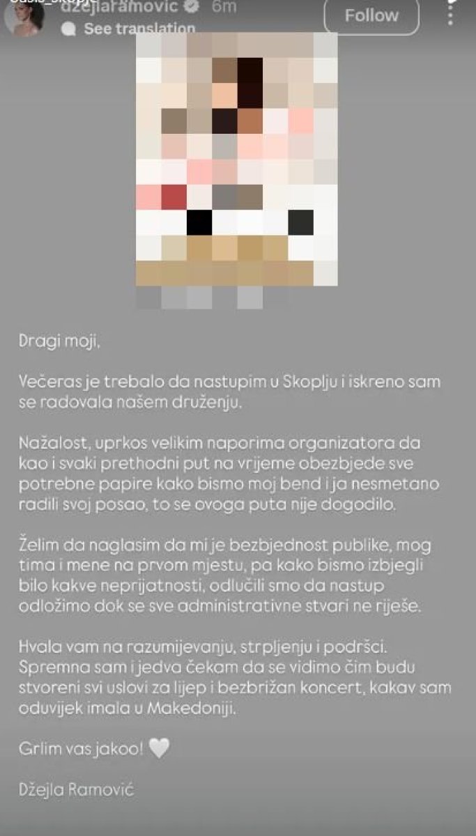 "Dragi moji, večeras je trebalo da nastupim u Skoplju i iskreno sam se radovala našem druženju. Nažalost, uprkos velikim naporima organizatora da kao i svaki prethodni put na vreme obezbede sve papire kako bismo moj bend i ja nesmetano radili svoj posao, to se ovoga puta nije dogodilo. Želim da naglasim da mi je bezbednost publike, mog tima i mene na prvom mestu, pa kako bismo izbegli bilo kakve neprijatnosti odlučili smo da nastup odložimo sve dok se administrativne stvari ne reše", napisala je Džejla.