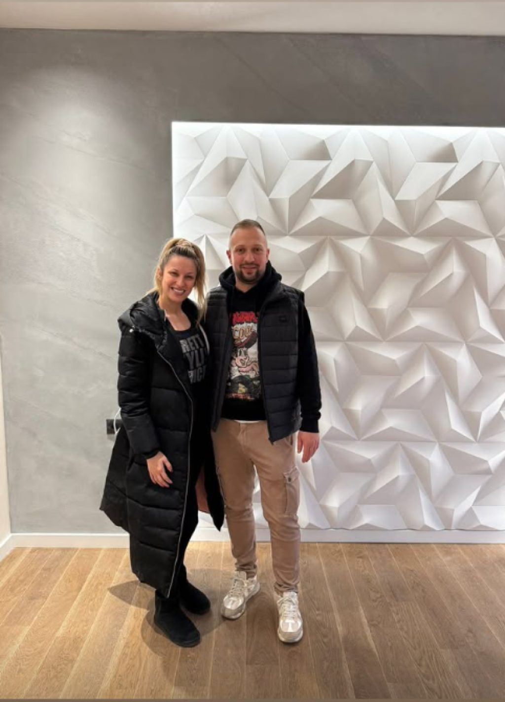 Iza nje se vidi zid ukrašen modernim 3D dekorativnim panelima u reljefnom geometrijskom stilu, kakvi se najčešće mogu videti u luksuznim enterijerima i novogradnji višeg standarda. Pratioci su odmah primetili i visoke plafone, prozračan prostor i minimalistički dizajn, što dodatno naglašava osećaj luksuza.