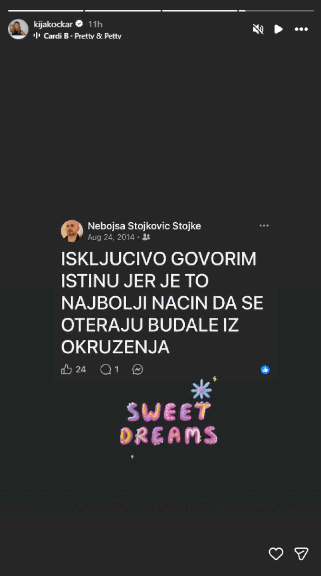 Bivša voditeljka Kristina Kija Kockar ne prestaje da "pecka" nekadašnju prijateljicu, pevačicu Katarinu Živković i njenog supruga Nebojšu Stojkovića Stojketa, čiji je status objavila.