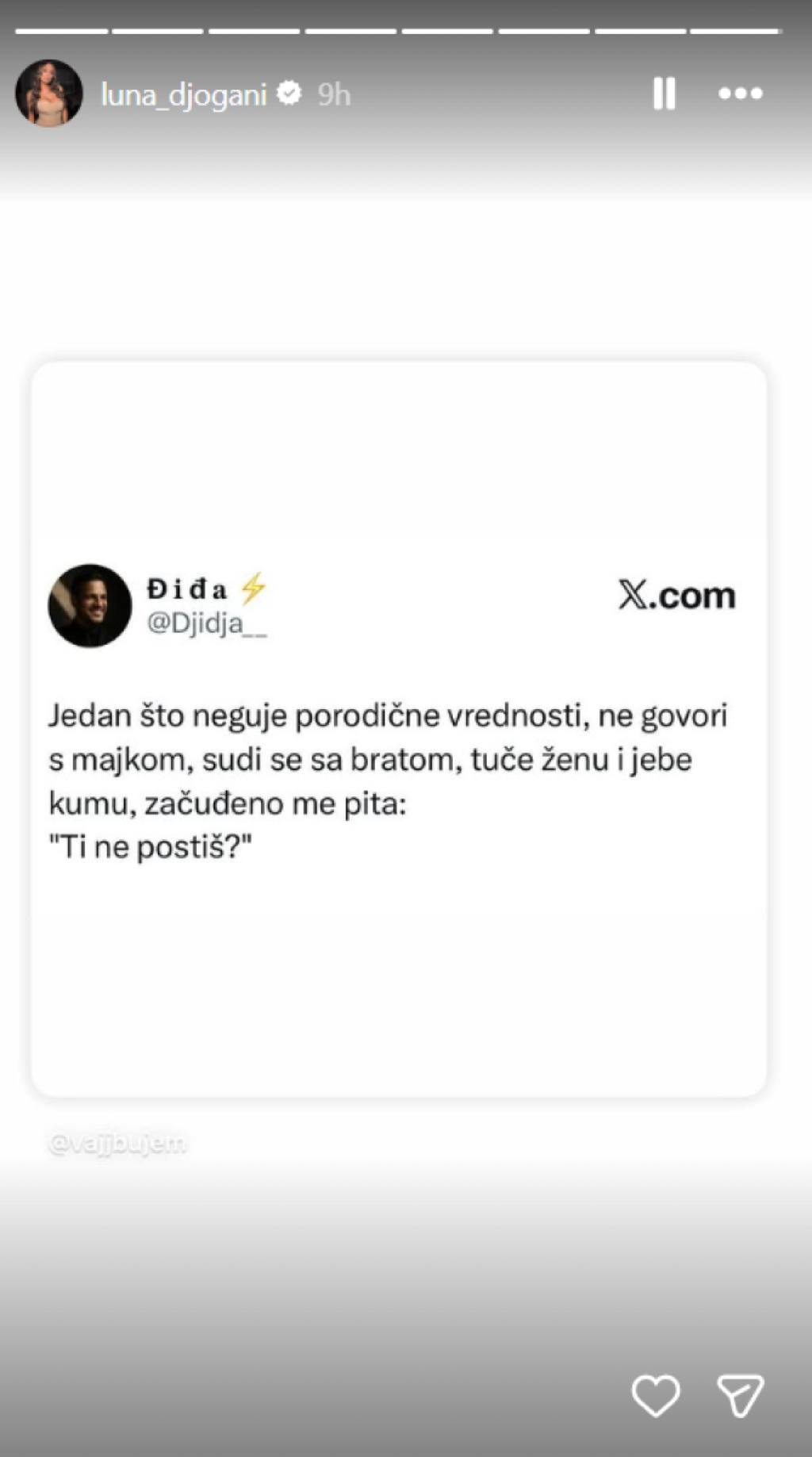 "Jedan što neguje porodične vrednosti, ne govori sa majkom, sudi se sa bratom, j*** kumu, a začuđeno me pita: 'Ti ne postiš?'", napisala je Luna na svom profilu.