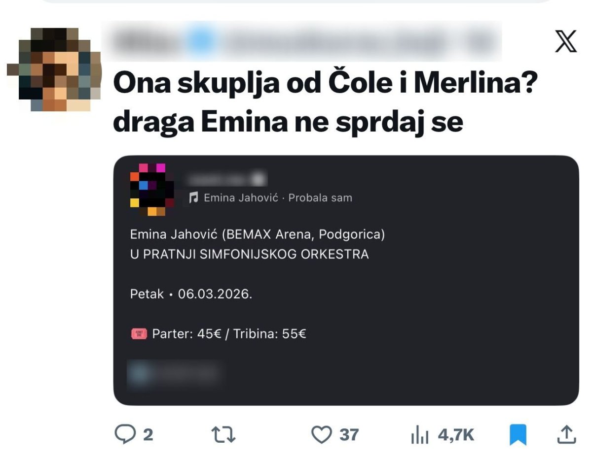 "Ona skuplja od Čole? Draga Emina ne sprdaj se. Opravdano je ako je neki hotel, restoran, klub, a koncert gde stojiš to je već previše", stoji u objavi ispod koje su cene karata za njen koncert.