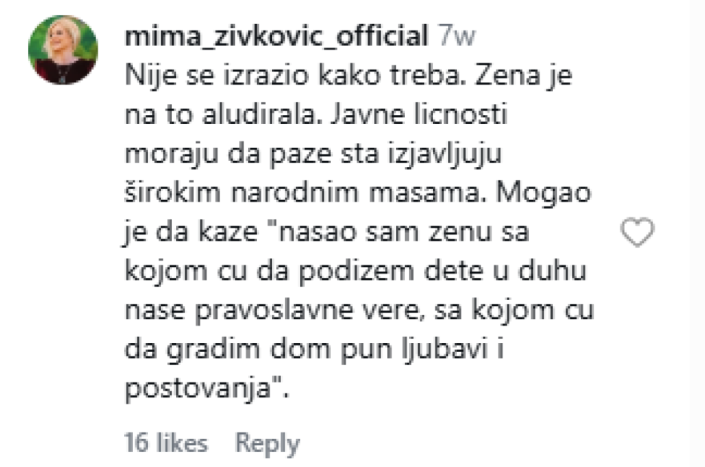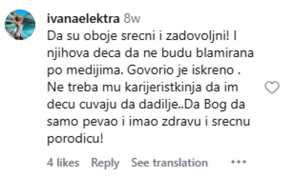 "Da su oboje srećni i zadovoljni! I njihova deca da ne budu blamirana po medijima. Govorio je iskreno. Ne treba mu karijeristkinja da im decu čuvaju dadilje... Da Bog da samo pevao i imao zdravu i srećnu porodicu."
