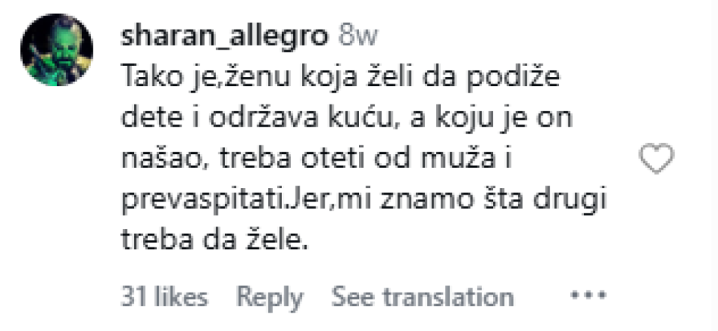 "On je baš javno ponizio svoju izabranicu, to što je on naveo apsolutno se podrazumeva kod jedne normalne žene, jezivo", "Zamislite da je ta ista žena javno rekla: 'Ja sam našla muškarca koji će da zarađuje i donosi pare', užasno", "Čovek našao kućnu pomoćnicu", "Nađu sebi domaćicu da im bude kući, a vamo je varaju sa kim stignu", "Greška prirode", "Ograničen je kao balkon", "Tuga za koga se udala ova lepotica", samo su neki od komentara.