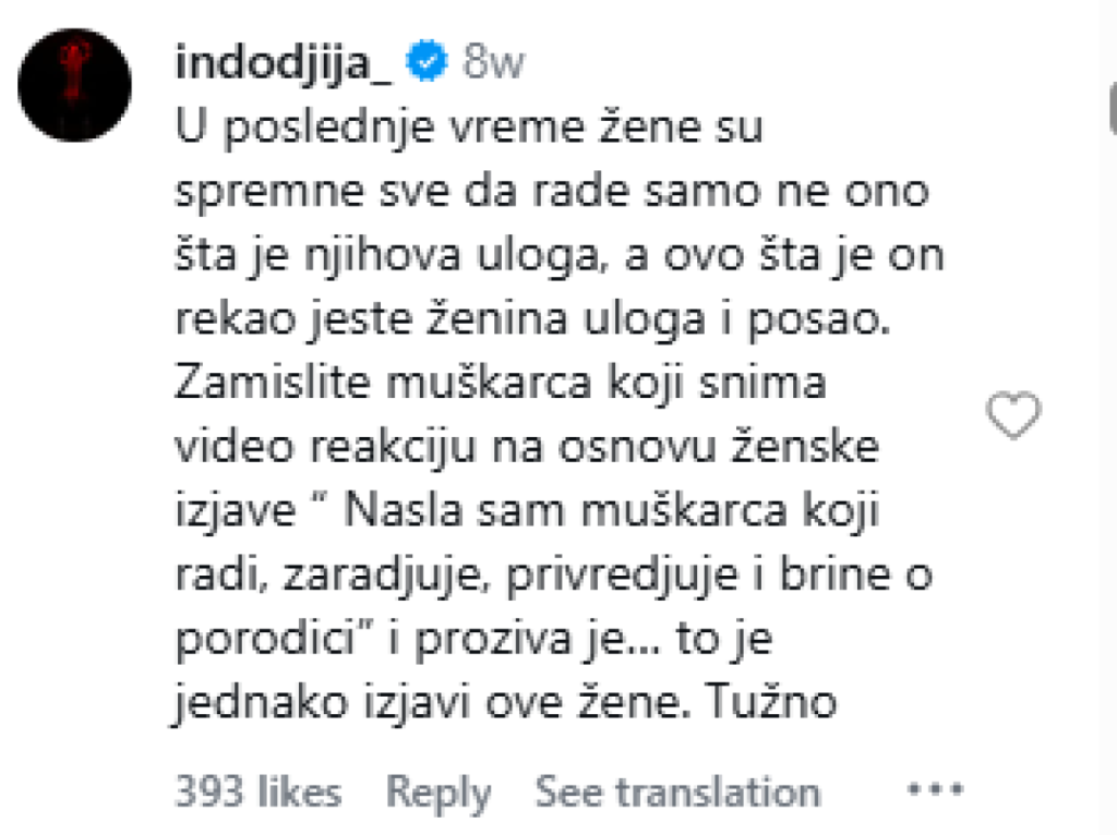 "U poslednje vreme žene su spremne sve da rade samo ne ono šta je njihova uloga, a ovo šta je on rekao jeste ženina uloga i posao. Zamislite muškarca koji snima video reakciju na osnovu ženske izjave 'Našla sam muškarca koji radi, zarađuje, privređuje i brine o porodici' i proziva je... to je jednako izjavi ove žene. Tužno", napisala je Indođija, a mnogo ljudi se složilo sa njom.