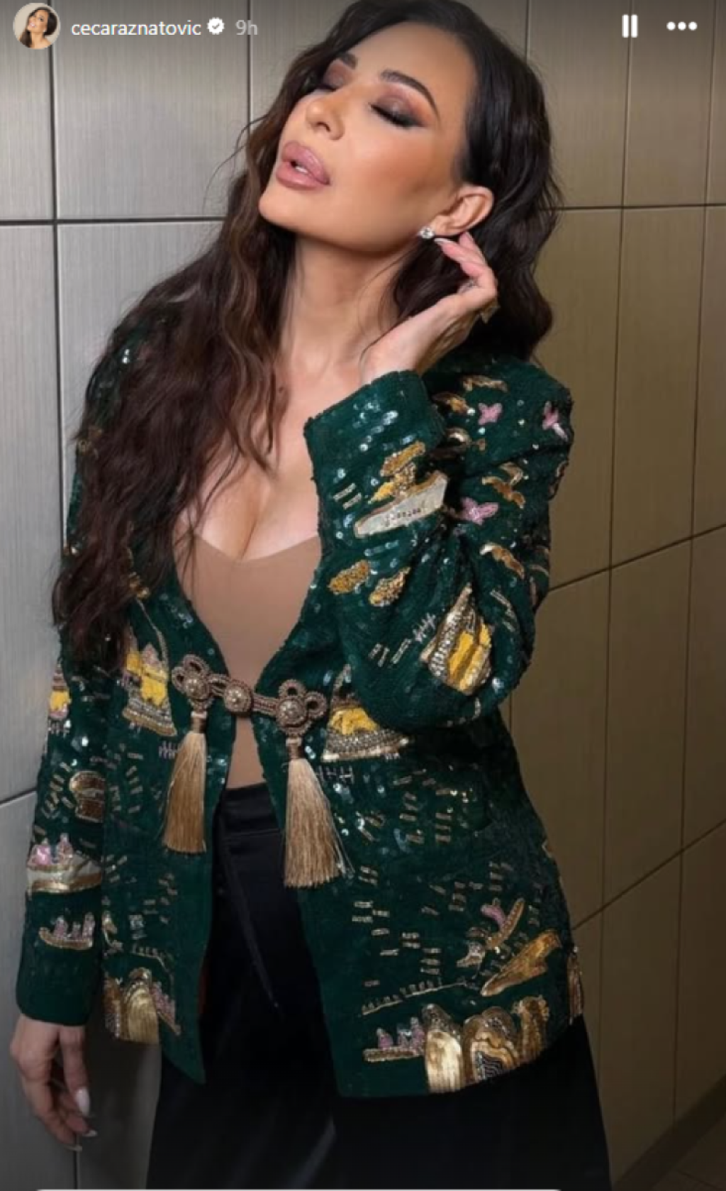 Reč je o raskošnom komadu u zelenoj boji, bogato ukrašenom zlatnim detaljima i resama, koji odiše visokom modom i luksuzom svetskih modnih pista. Iako je u pitanju ekstremno skup komad garderobe, na Ceci izgleda potpuno kežual. Cipele i nakit na pevačici, iako su nenametljivi, vrede mnogo.