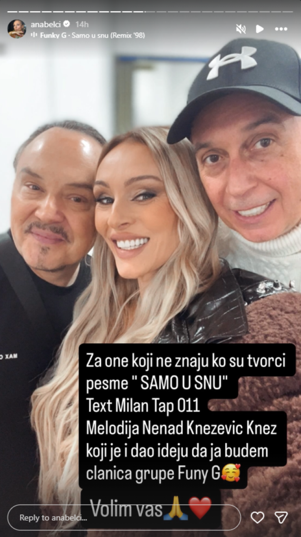 "Za one koji ne znaju ko stoji iza pesme 'Samo u snu' - tekst je pisao Milan, a muziku Knez, koji mi je i dao ideju da postanem pevačica grupe Funky G. Volim vas", napisala je Anabela na svom storiju.
