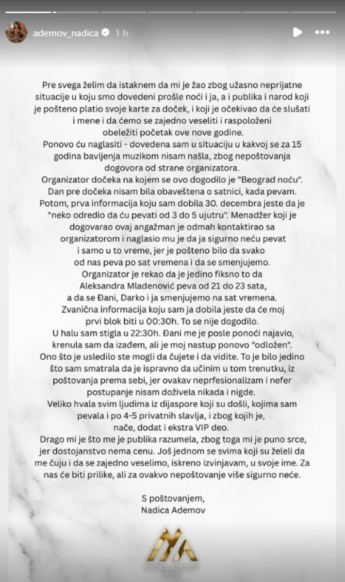 "Pre svega želim da istaknem da mi je žao zbog užasno neprijatne situacije u koju smo dovedeni prošle noći – i ja, ali i publika, kao i narod koji je pošteno platio karte za doček i očekivao da će me slušati i da ćemo zajedno obeležiti početak nove godine. Ponovo naglašavam - dovedena sam u situaciju u kakvoj se za 15 godina bavljenja muzikom nisam našla, i to zbog nepoštovanja dogovora od strane organizatora", započela je Nadica.