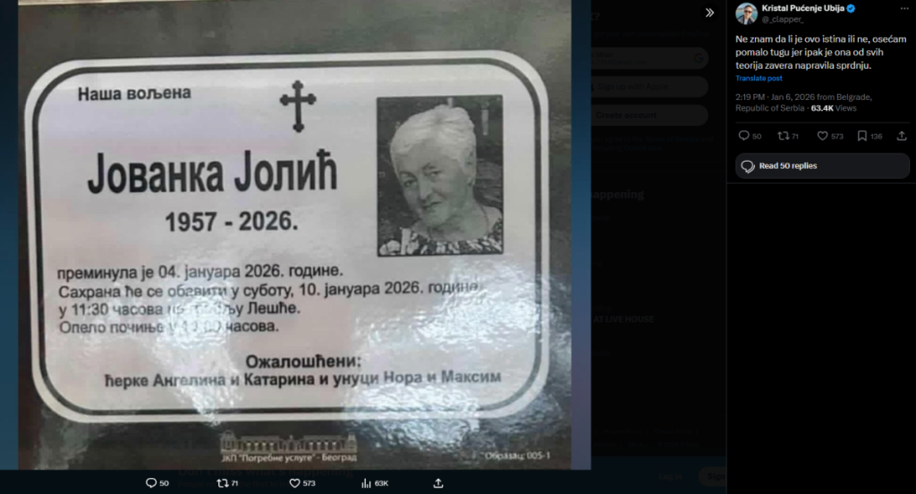 Teoretičarka zavere i internet zvezda Jovanka Jolić je preminula četvrtog januara, a sahrana će se obaviti desetog, na groblju Lešće u Beogradu.
