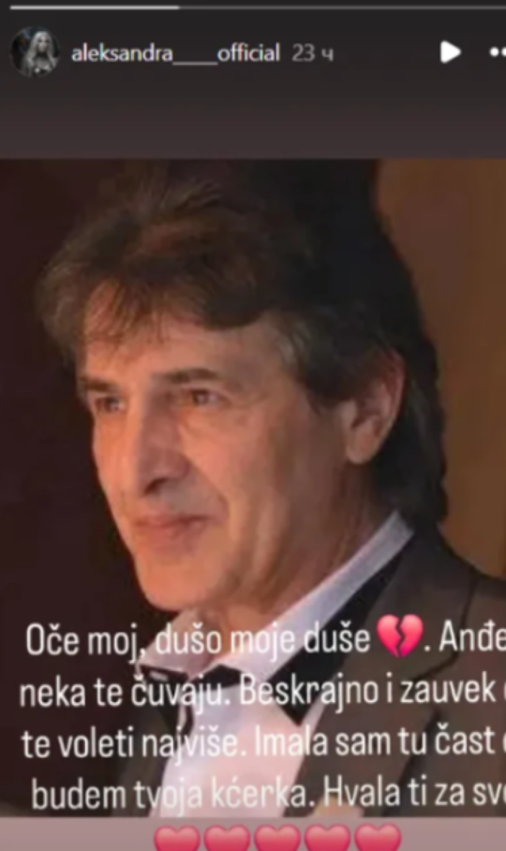 "Oče moj, dušo moje duše... Anđeli neka te čuvaju. Beskrajno i zauvek ću te voleti najviše. Imala sam tu čast da budem tvoja ćerka. Hvala ti za sve", napisala je Aleksandra uz očevu fotografiju na Instagramu, izražavajući duboku tugu i zahvalnost.