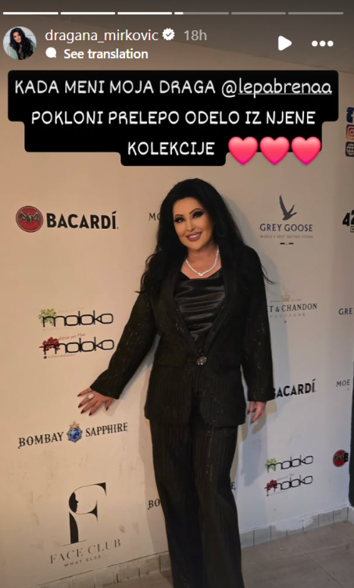 Dragana Mirković već godinama neguje blisko prijateljstvo sa folk pevačicom Lepom Brenom, a njihova međusobna podrška i poštovanje često su vidljivi i u javnosti.