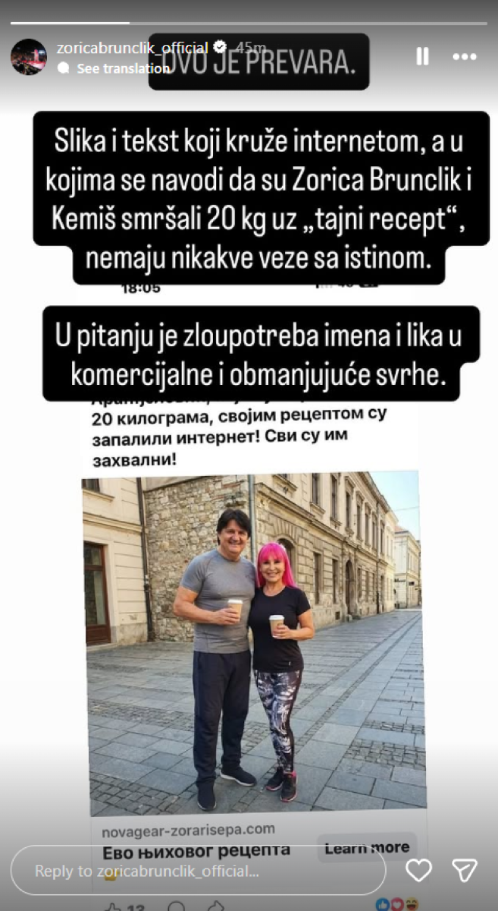 "Ovo je prevara. Slika i tekst koji kruže internetom, a u kojima se navodi da su Zorica Brunclik i Kemiš smršali 20 kilograma uz 'tajni recept', nemaju nikakve veze sa istinom. U pitanju je zloupotreba imena i lika u komercijalne i obmanjujuće svrhe", napisala je Zorica Brunclik.