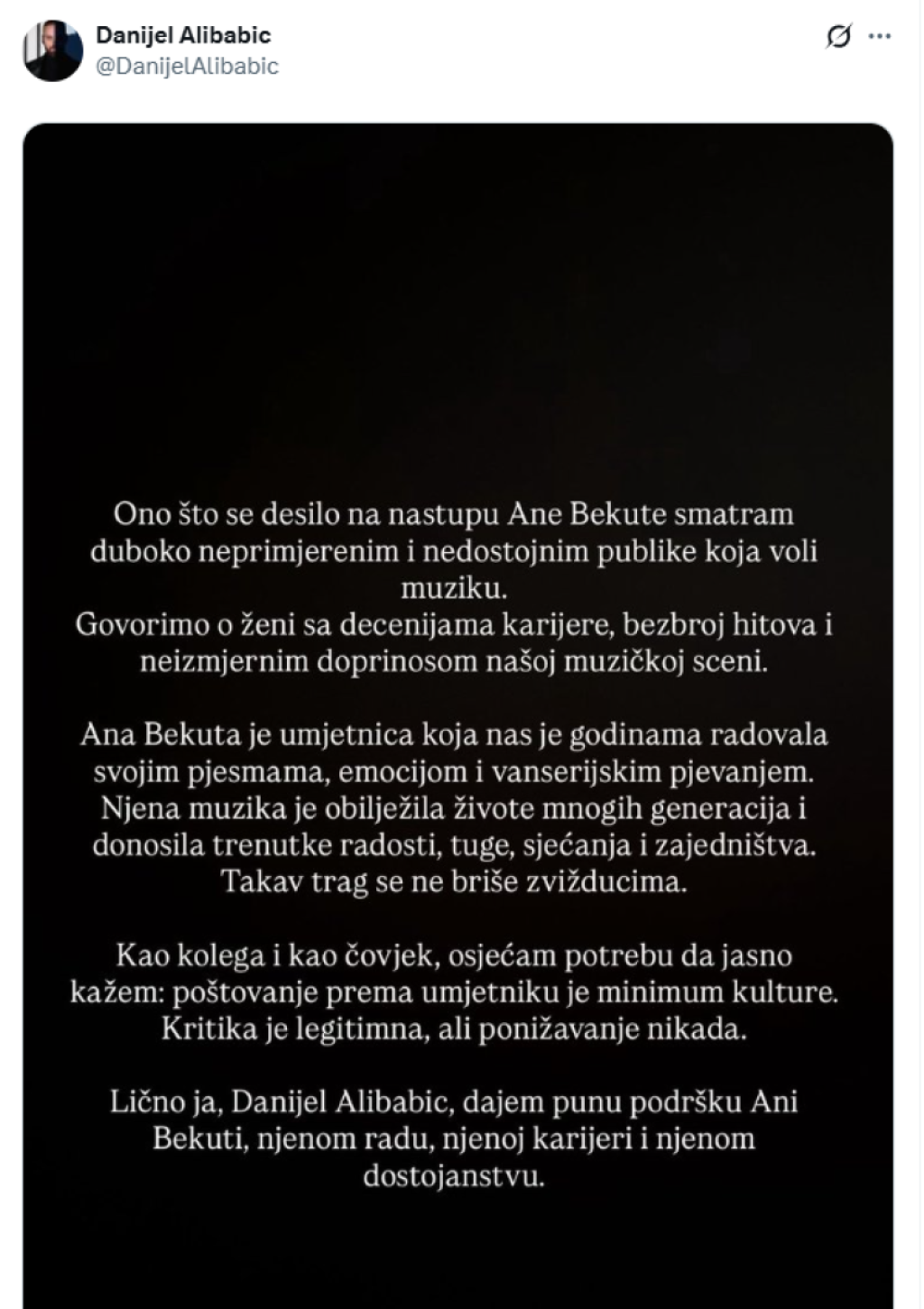 "Njena muzika je obeležila živote mnogih generacija i donosila trenutke radosti, tuge, sećanja i zajedništva. Takav trag se ne briše zvižducima. Kao kolega i kao čovek, osećam potrebu da jasno kažem: poštovanje prema umetniku je minimum kulture. Kritika je legitimna ali ponižavanje nikada. Lično ja, Danijel Alibabić dajem punu podršku Ani Bekuti, njenom radu, njenoj karijeri i njenom dostojanstvu".