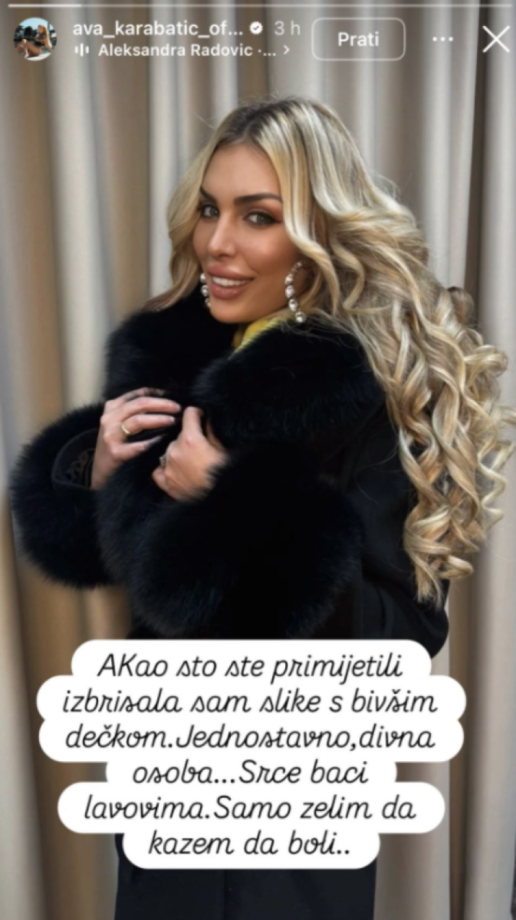 "Kao što ste primetili, izbrisala sam slike s bivšim dečkom. Jednostavno, divna osoba... Srce baci lavovima. Samo želim da kažem da boli...", napisala je Ava, pa dodala: