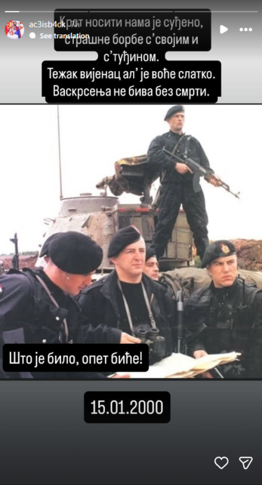 "Krst nositi nama je suđeno, strašne borbe s' svojim i s' tuđinom. Težal vijenac, al' je voće slatko. Vaskrsenje ne biva bez smrti. Šta je bilo, opet biće. 15.01.2000." - napisao je Veljko uz Arkanovu fotografiju.