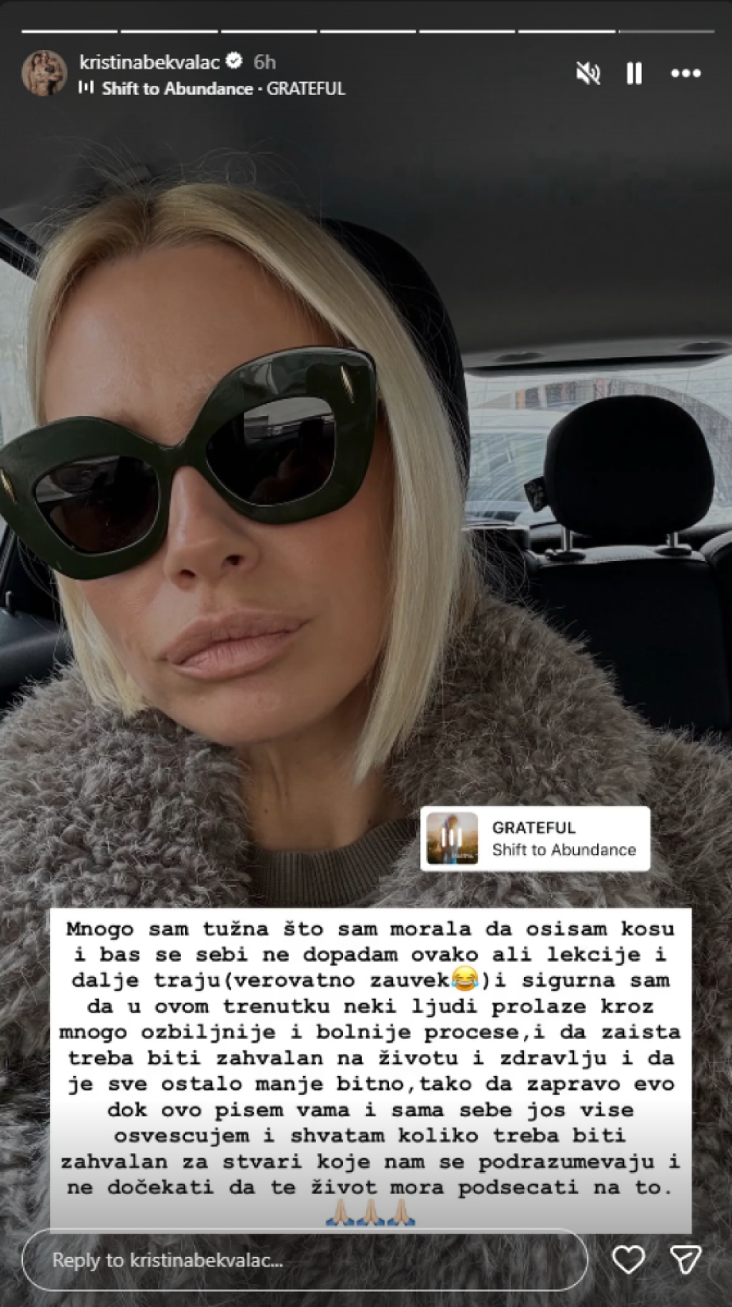"Mnogo sam tužna što sam morala da ošišam kosu i baš se sebi ne dopadam ovako ali lekcije i dalje traju (verovatno zauvek) i sigurna sam da u ovom trenutku neki ljudi prolaze kroz mnogo ozbiljnije i bolnije procese, i da zaista treba biti zahvalan na životu i zdravlju i da je sve ostalo manje bitno, tako da zapravo evo dok ovo pišem vama i sama sebe još više osvešćujem i shvatam koliko treba biti zahvalan za stvari koje nam se podrazumevaju i ne dočekati da te život mora podsećati na to" - napisala je ona.