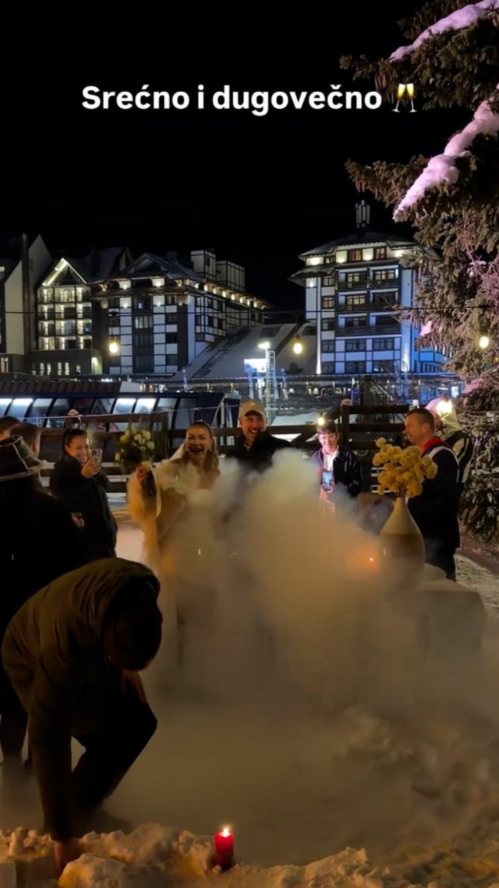 Svečanost je protekla u intimnoj atmosferi, uz prisustvo nekolicine najbližih prijatelja. Na dnu staze bile su parkirane grtalice sa upaljenim svetlima, dok su prskalice i šareni dim u jednom trenutku dodatno upotpunili romantični ambijent.