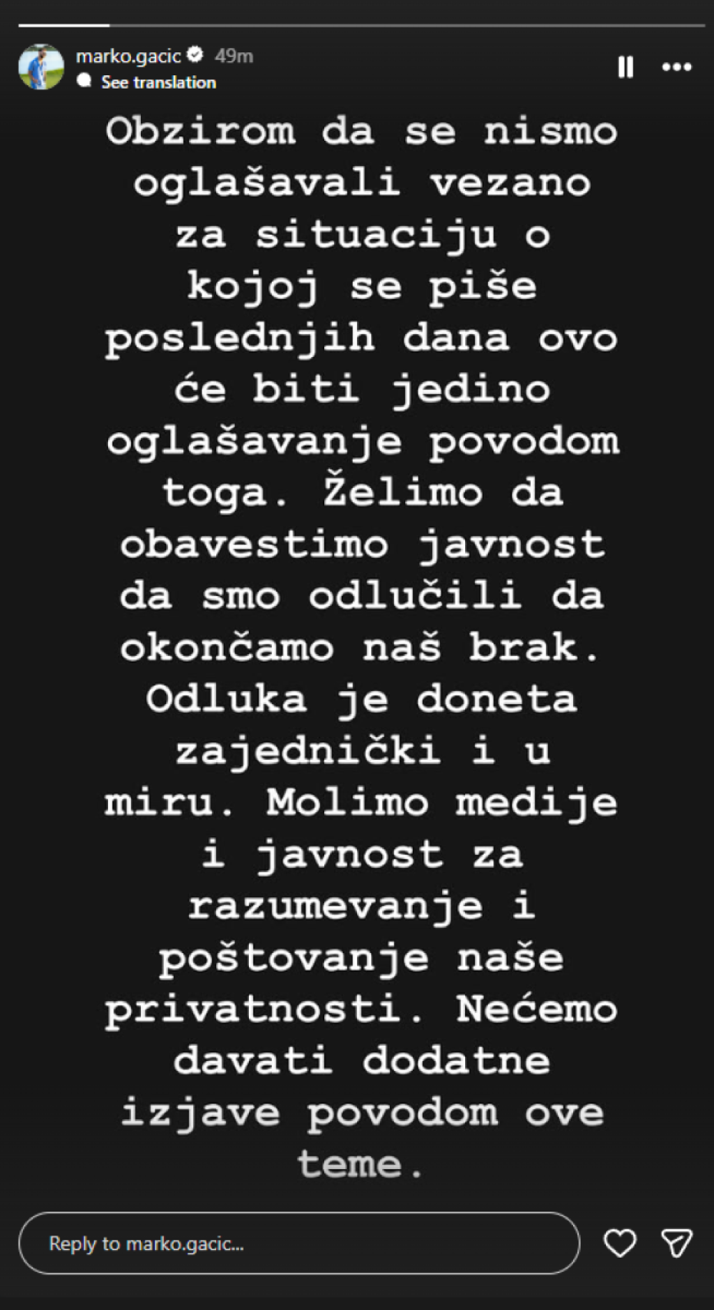 "Obzirom na to da se nismo oglašavali u vezi sa situacijom o kojoj se piše poslednjih dana, ovo će biti jedino naše saopštenje povodom toga. Želimo da obavestimo javnost da smo odlučili da okončamo brak. Odluka je doneta zajednički i u miru. Molimo medije i javnost za razumevanje i poštovanje naše privatnosti. Nećemo davati dodatne izjave o ovoj temi", napisao je Marko Gačić.