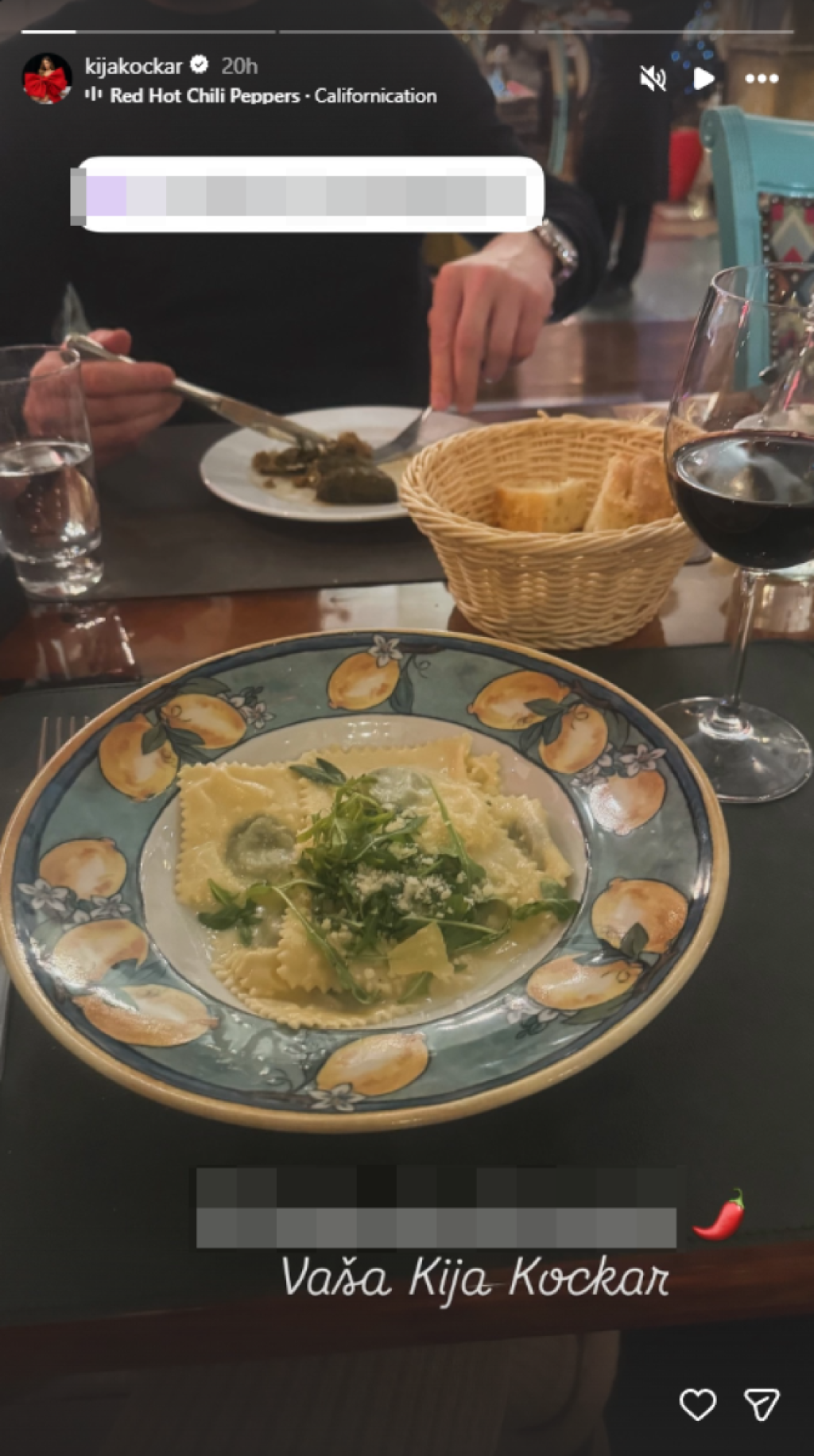 Tokom večeri par je uživao u crvenom vinu, dok je Kija, kao i ranije, ostala zagonetna kada je u pitanju identitet njenog izabranika, s obzirom na to da njegovo lice nije bilo vidljivo.