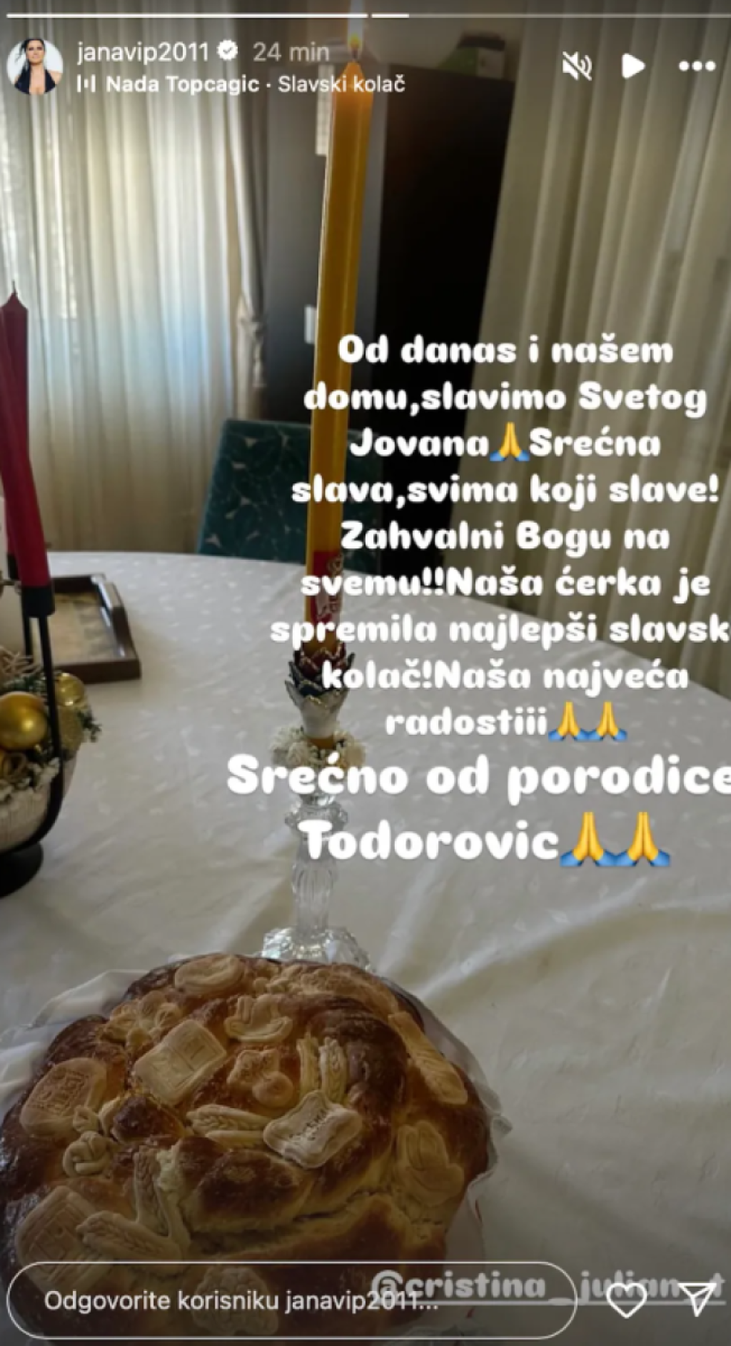 Jana je uslikala slavski kolač i sveću na stolu, a potom je sa svojim pratiocima podelila delić atmosfere.