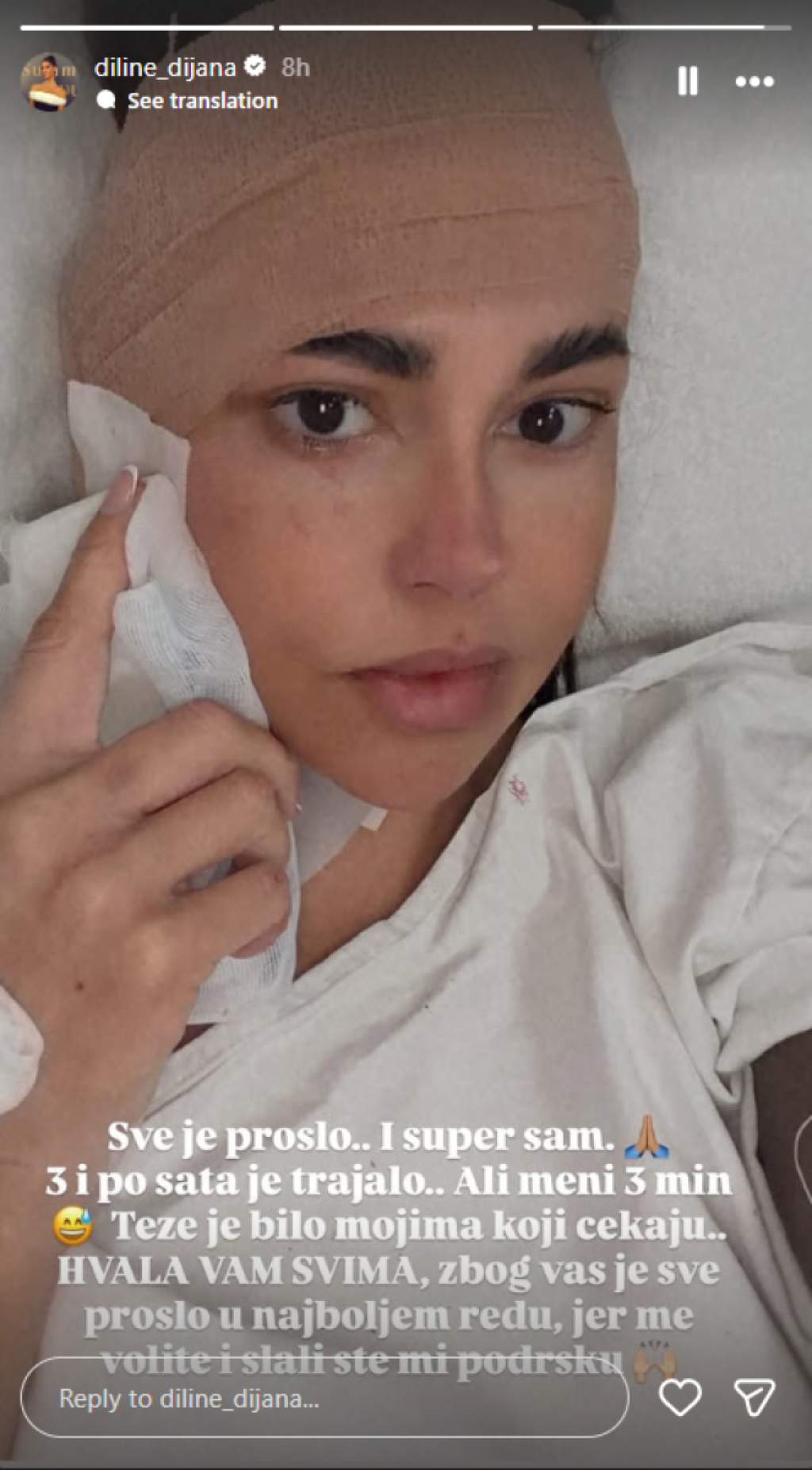 "Sve je prošlo i super sam. Operacija je trajala tri i po sata, ali meni tri minuta. Teže je bilo mojima koji čekaju. Hvala vam svima", napisala je Dijana uz sliku na kojoj se vidi da joj je zavijena glava, dok gazu drži na licu.
