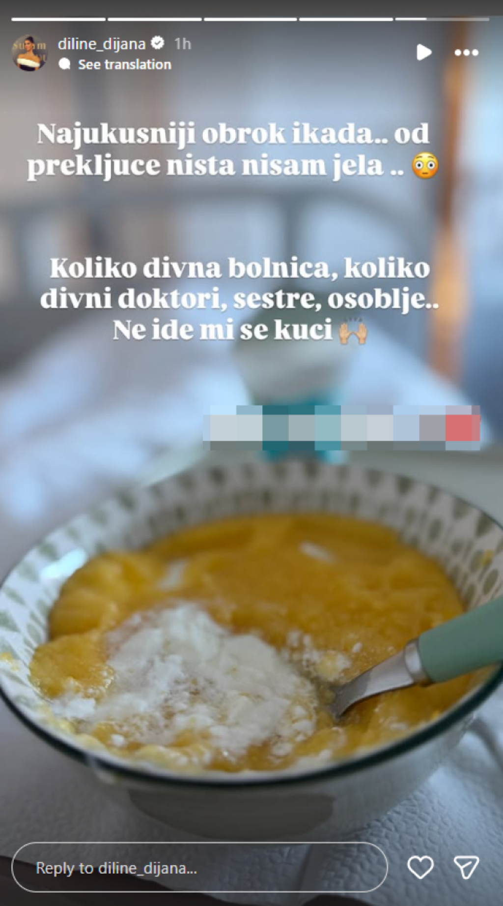 "Najukusniji obrok ikada. Od prekjuče ništa nisam jela. Koliko divna bolnica, koliko divni doktori, sestre i osoblje - ne ide mi se kući."