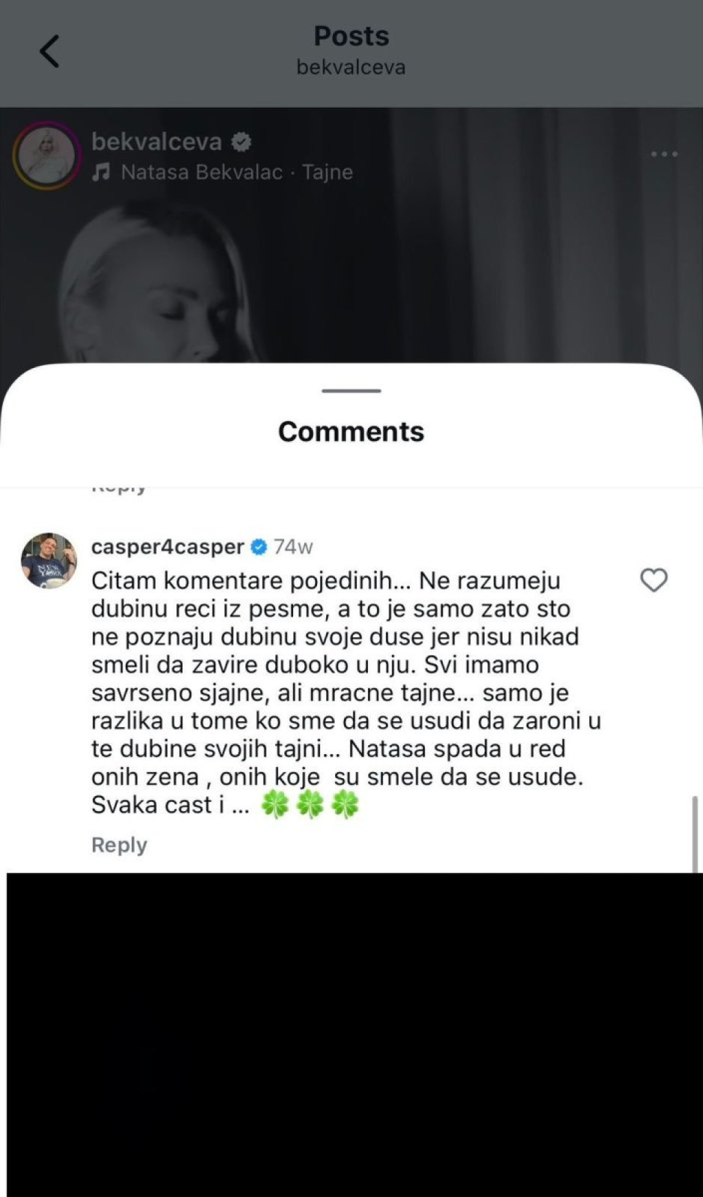 "Čitam komentare pojedinih... Ne razumeju dubinu reči iz pesme, a to je samo zato što ne poznaju dubinu svoje duše jer nisu nikad smeli da zavire duboko u nju. Svi imamo savršeno sjajne, ali mračne tajne... Samo je razlika u tome ko sme da se usudi da zaroni u te dubine svojih tajni... Nataša spada u red onih žena, onih koje su smele da se usude. Svaka čast i srećno.", hvalio je on pevačicu na mrežama.