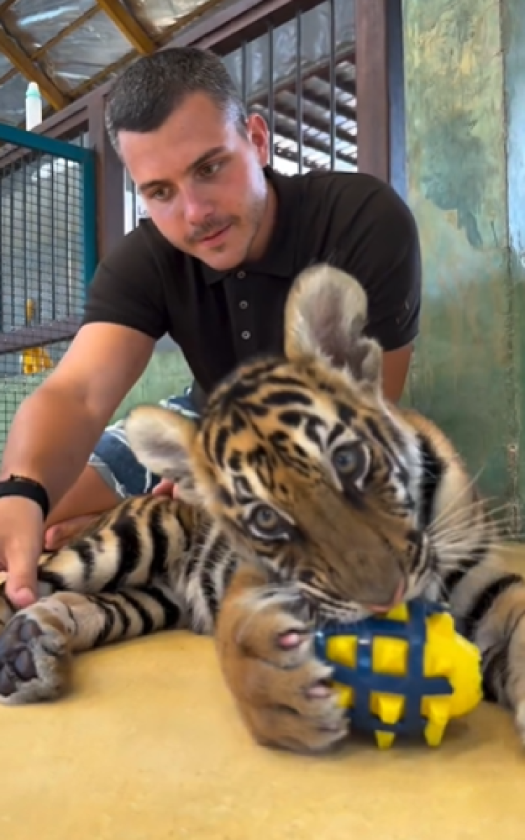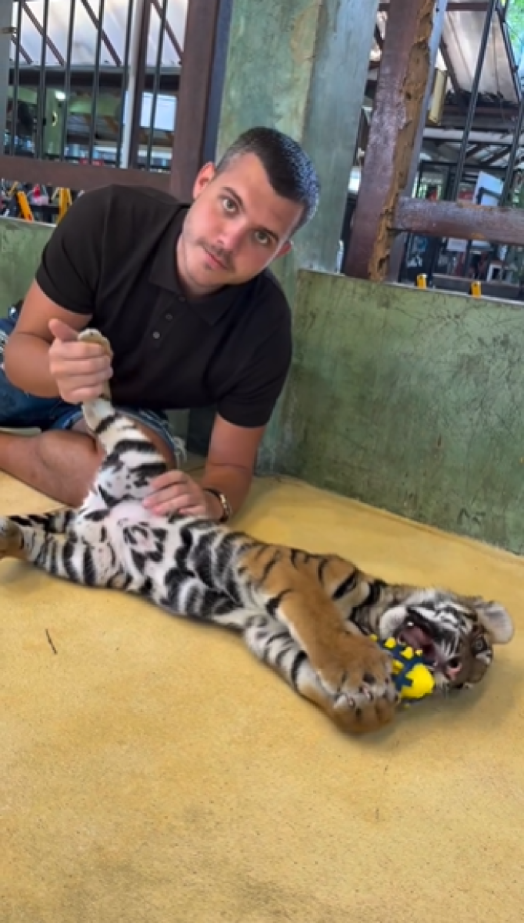 Viktor, kome je majka Lepa Brena dala zasluženi odmor, ali i platu na koju je dugo čekao, je tigru povukao nogu, a onda ga mazio po stomaku i vrteo njegov rep, kao da se igra sa najbezazlenijom životinjom na svetu, a ne sa opasnom zverkom.