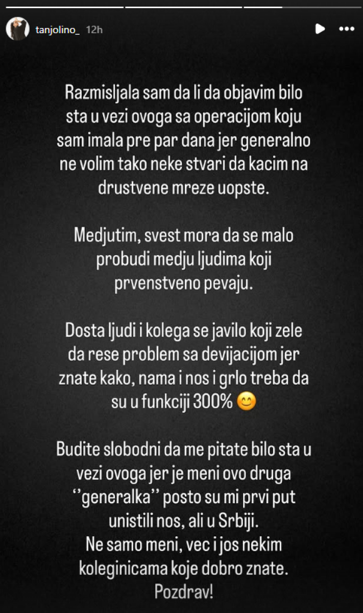 "Razmišljala sam da li da objavim bilo šta u vezi ove operacije koju sam imala pre par dana, jer generalno ne volim da kačim takve stvari na društvene mreže. Međutim, svest mora da se malo probudi među ljudima koji prvenstveno pevaju. Dosta ljudi i kolega se javilo koji žele da reše problem sa devijacijom, jer nama i nos i grlo moraju da budu u funkciji 300 odsto", napisala je Tatjana.