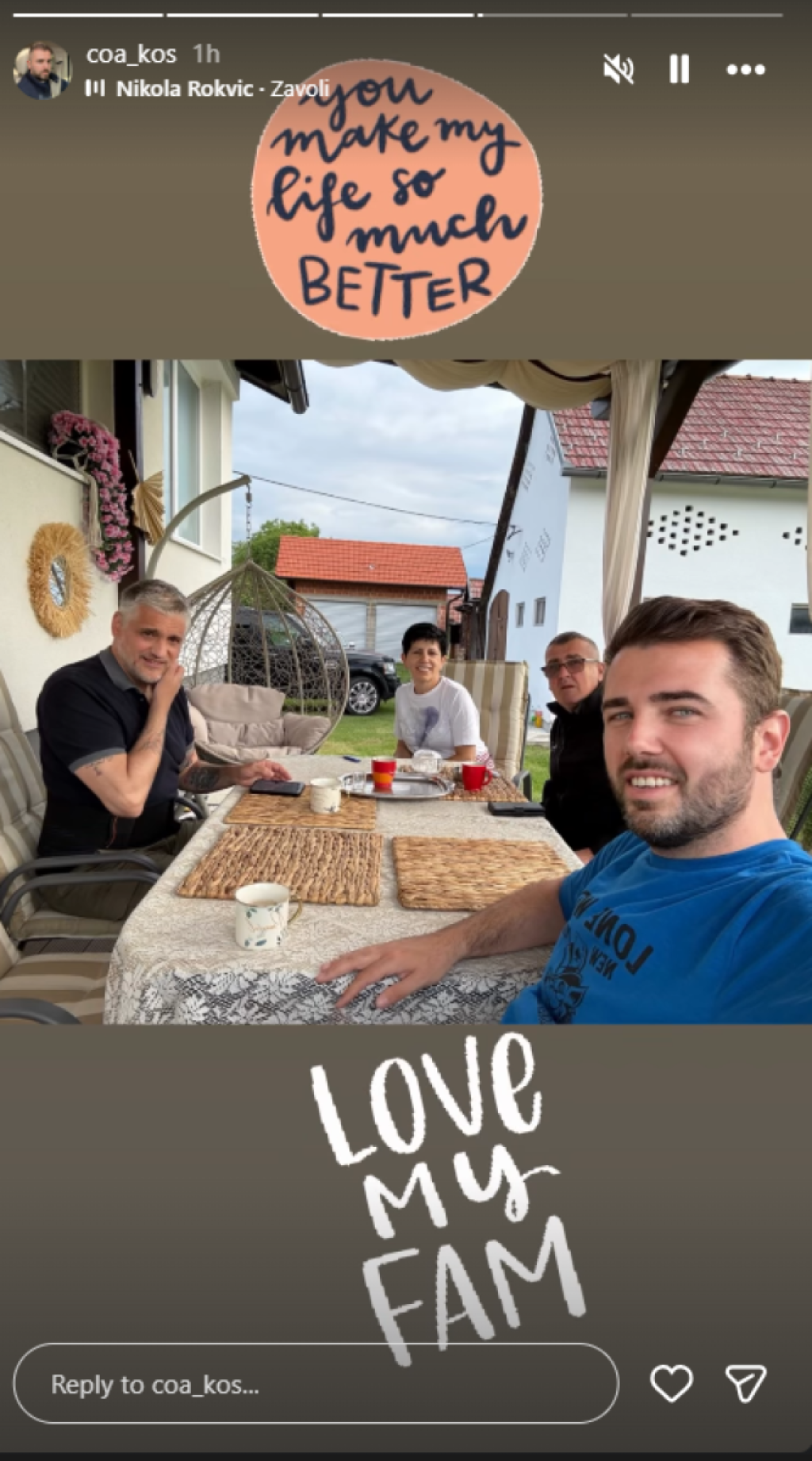Na fotografiji koju je objavio na Instagram storiju svi zajedno piju kafu za stolom u bašti. Kako su svi u letnjoj garderobi, može se zaključiti da su slike nastale dosta ranije.