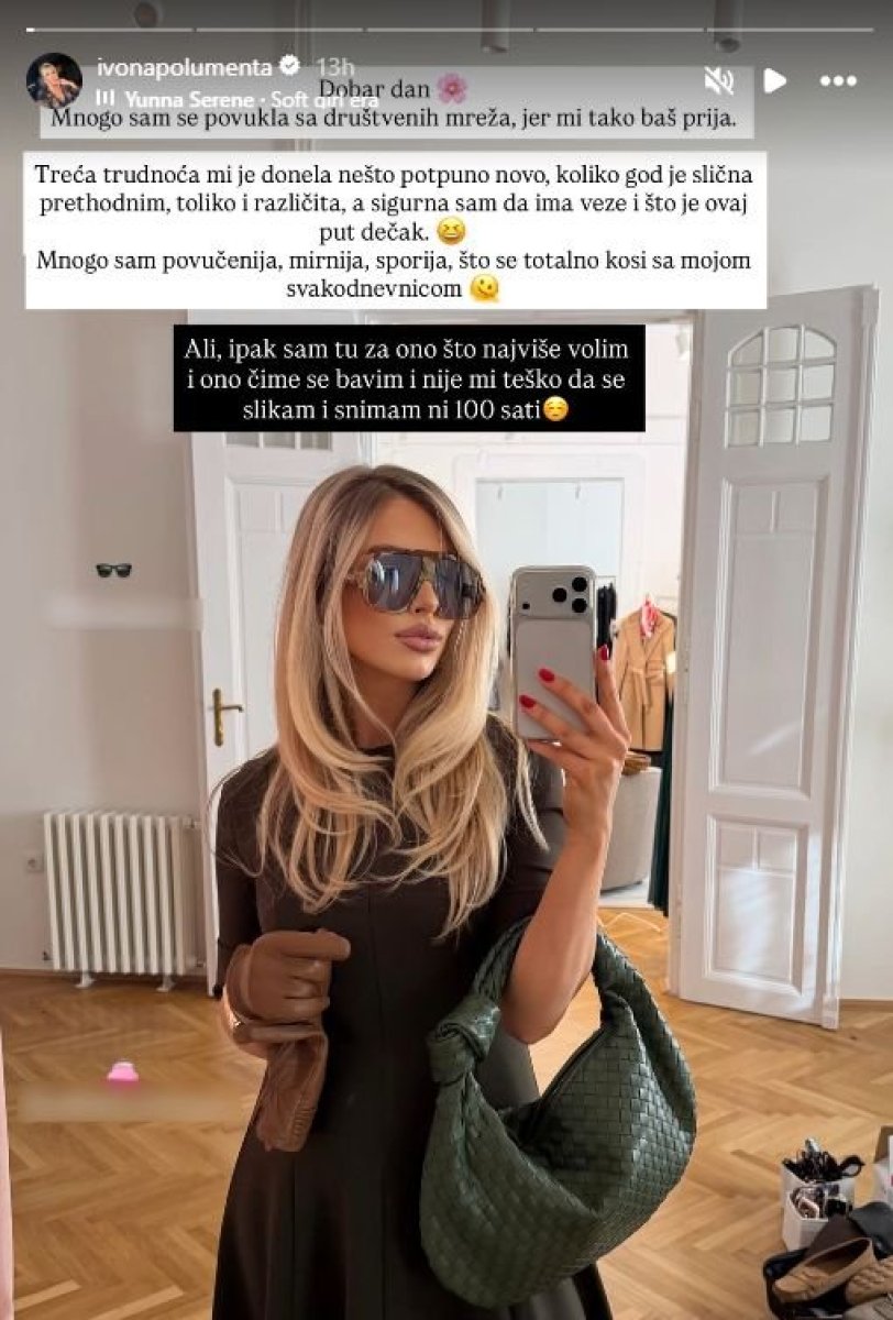 "Mnogo sam se povukla sa društvenih mreža jer mi tako baš prija. Treća trudnoća mi je donela nešto potpuno novo, koliko god slična prethodnim, toliko i različita, a sigurna sam da ima veze i što je ovaj put dečak. Mnogo sam povučenija, mirnija, sporija, što se totalno kosi sa mojom svakodnevnicom", napisala je Ivona.