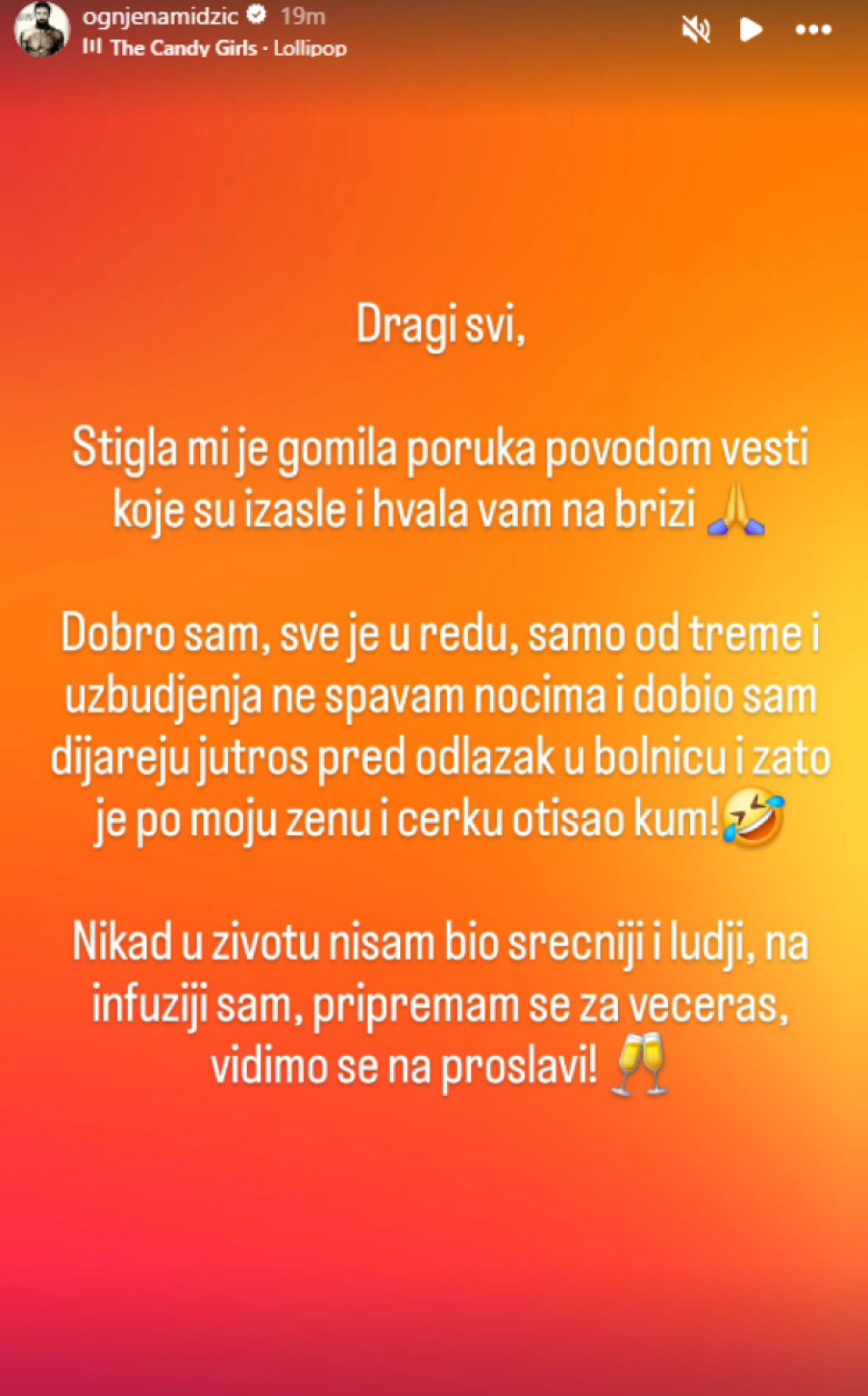 "Dragi svi, stigla mi je gomila poruka povodom vesti koje su izašle i hvala vam na brizi. Dobro sam, sve je u redu, samo od treme i uzbuđenja ne spavam noćima i dobio sam dijareju jutros pred odlazak u bolnicu i zato je po moju ženu i ćerku otišao kum. Nikad u životu nisam bio srećniji i luđi, na infuziji sam, pripremam se za večeras, vidimo se na proslavi", poručio je Ognjen.