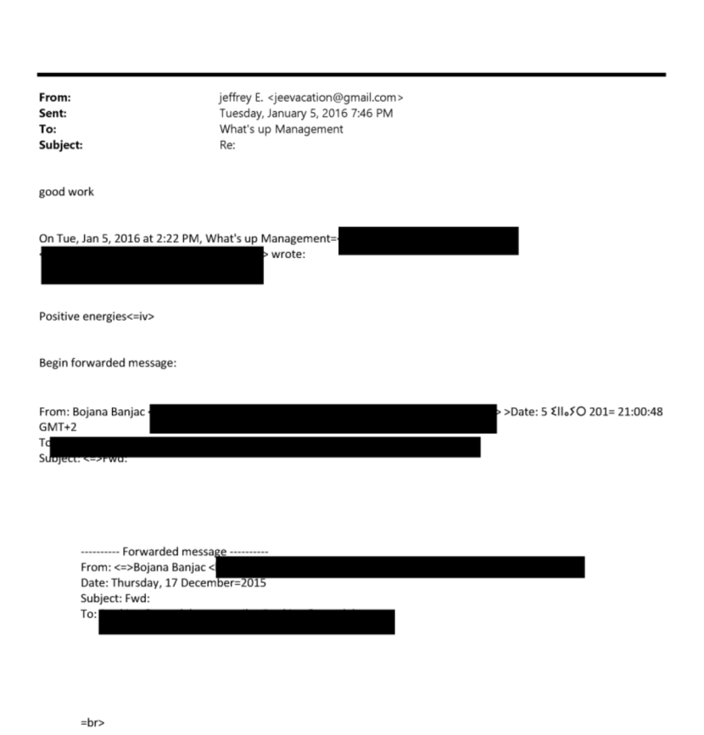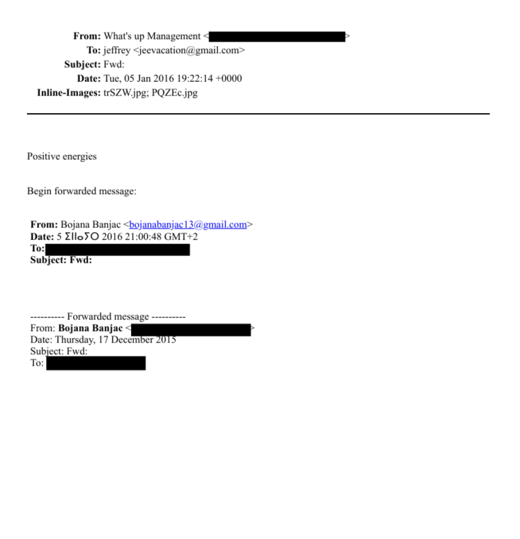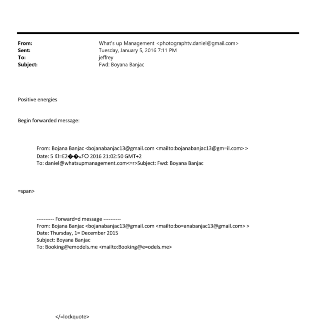 Dokumenti ukazuju da se Bojanino ime pojavljuje u mejlovima u kojima je navodna agencija predlagala potencijalne modele Epstinu. Međutim, ne postoji dokaz o direktnoj komunikaciji između Bojane Banjac i Epstina.
