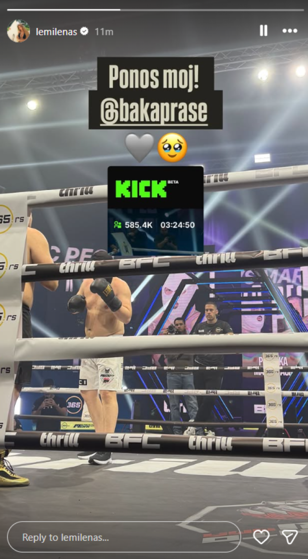 Među publikom, tik uz ring, našla se i Milena, poznatija kao Lemilena, koja nije krila koliko je ponosna na izabranika. Ona se kratko oglasila porukom: