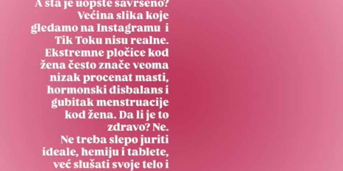 "Sama treniram. Jednostavno sam za sve ove godine shvatila šta mi donosi najviše napretka (nema filozofije). Trenutno zbog povišenog kortizola ne smem preterivati. Treniram 1 put donji deo, 1 put gornji deo i 2-3 puta šetam na traci", napisala je pevačica.