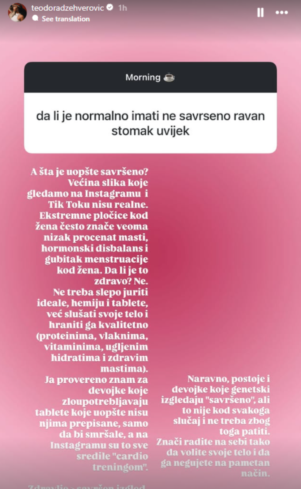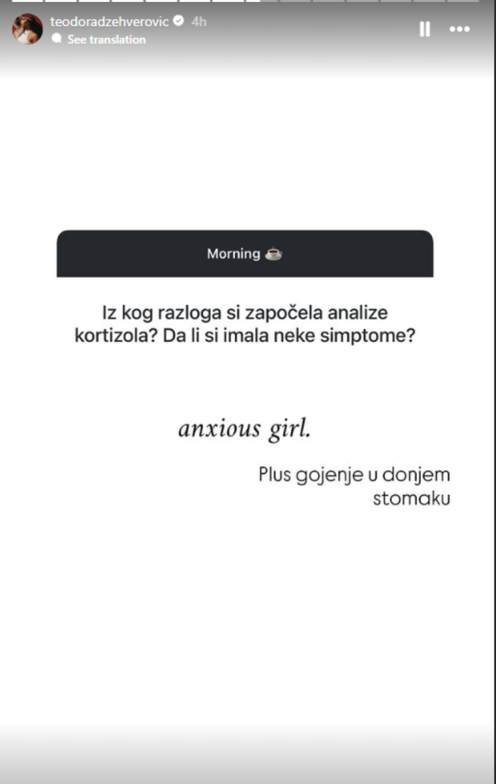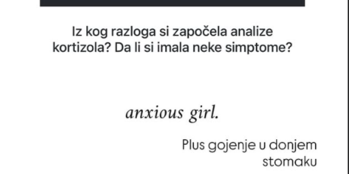 Odgovarajući na pitanja pratilaca na Instagramu, Teodora je pričala i o ovom problemu. Jedno od pitanja je glasilo da li trenira sama ili radi sa nekim i u ovom odgovoru je otkrila da ima povišen kortizol.