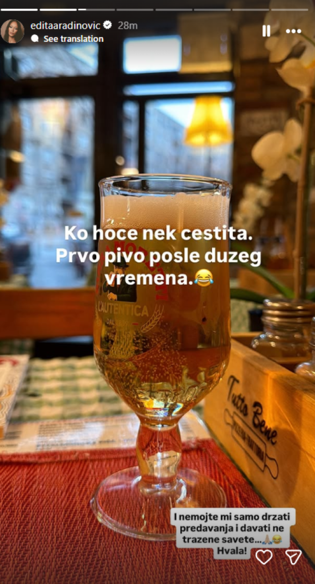 Edita je nedavno raskinula vezu sa Nenadom Stevićem, sa kojim čeka dete. Aktivna je na društvenim mrežama, a sada je na Instagramu objavila stori na kojem se vidi pivo.